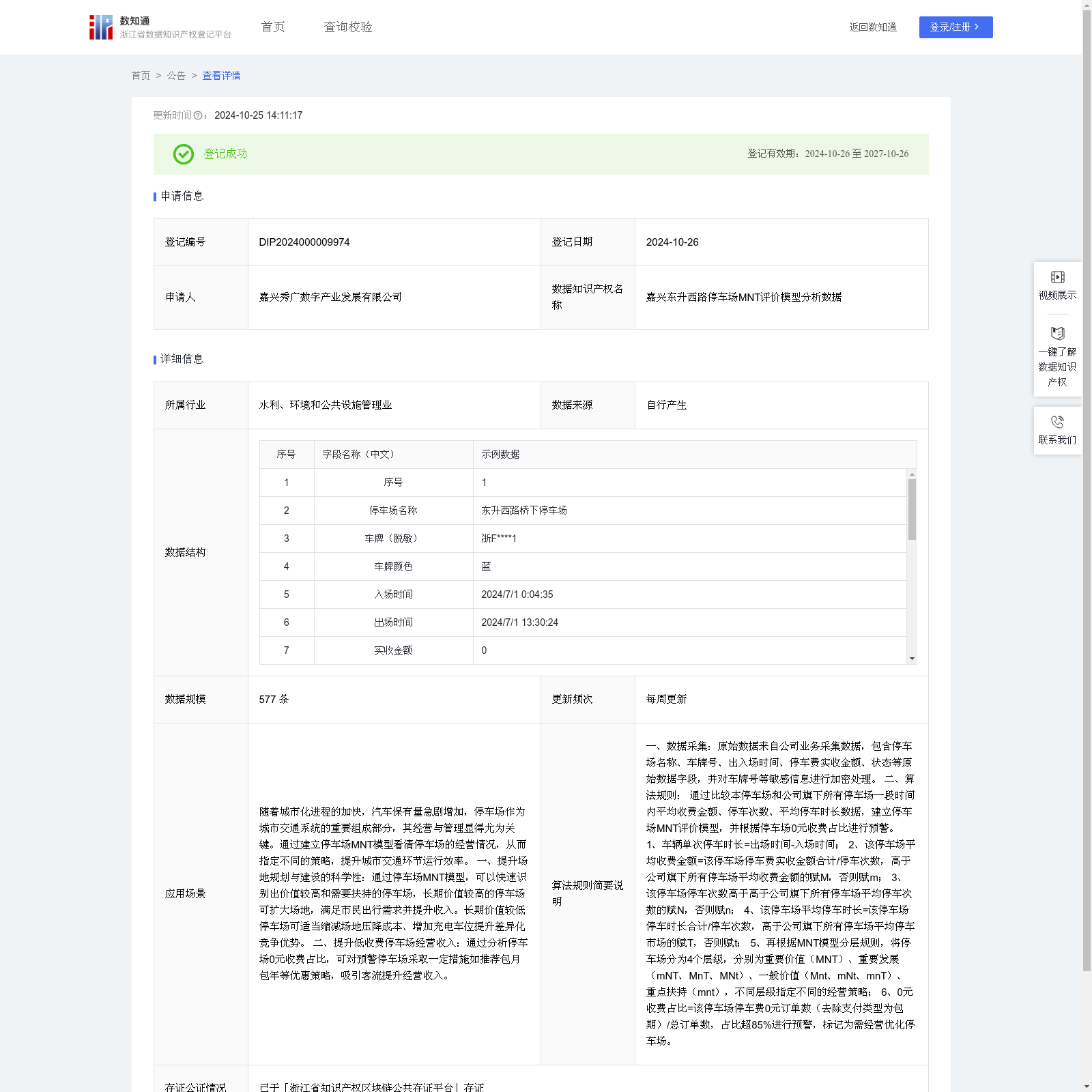 嘉兴秀广数字产业发展有限公司 本次登记的数据知识产权 嘉兴东升西路停车场MNT评价模型分析数据, 随着城市化进程的加快,汽车保有量急剧增加,停车场作为城市交通系统的重要组成部分,其经营与管理显得尤为关键。通过建立停车场MNT模型看清停车场的经营情况,从而指定不同的策略,提升城市交通环节运行效率。 一、提升场地规划与建设的科学性:通过停车场MNT模型,可以快速识别出价值较高和需要扶持的停车场,长期价值较高的停车场可扩大场地,满足市民出行需求并提升收入。长期价值较低停车场可适当缩减场地压降成本、增加充电车位提升差异化竞争优势。 二、提升低收费停车场经营收入:通过分析停车场0元收费占比,可对预警停车场采取一定措施如推荐包月包年等优惠策略,吸引客流提升经营收入。一、数据采集:原始数据来自公司业务采集数据,包含停车场名称、车牌号、出入场时间、停车费实收金额、状态等原始数据字段,并对车牌号等敏感信息进行加密处理。 二、算法规则: 通过比较本停车场和公司旗下所有停车场一段时间内平均收费金额、停车次数、平均停车时长数据,建立停车场MNT评价模型,并根据停车场0元收费占比进行预警。 1、车辆单次停车时长=出场时间-入场时间; 2、该停车场平均收费金额=该停车场停车费实收金额合计/停车次数,高于公司旗下所有停车场平均收费金额的赋M,否则赋m; 3、该停车场停车次数高于高于公司旗下所有停车场平均停车次数的赋N,否则赋n; 4、该停车场平均停车时长=该停车场停车时长合计/停车次数,高于公司旗下所有停车场平均停车市场的赋T,否则赋t; 5、再根据MNT模型分层规则,将停车场分为4个层级,分别为重要价值(MNT)、重要发展(mNT、MnT、MNt)、一般价值(Mnt、mNt、mnT)、重点扶持(mnt),不同层级指定不同的经营策略; 6、0元收费占比=该停车场停车费0元订单数(去除支付类型为包期)/总订单数,占比超85%进行预警,标记为需经营优化停车场。