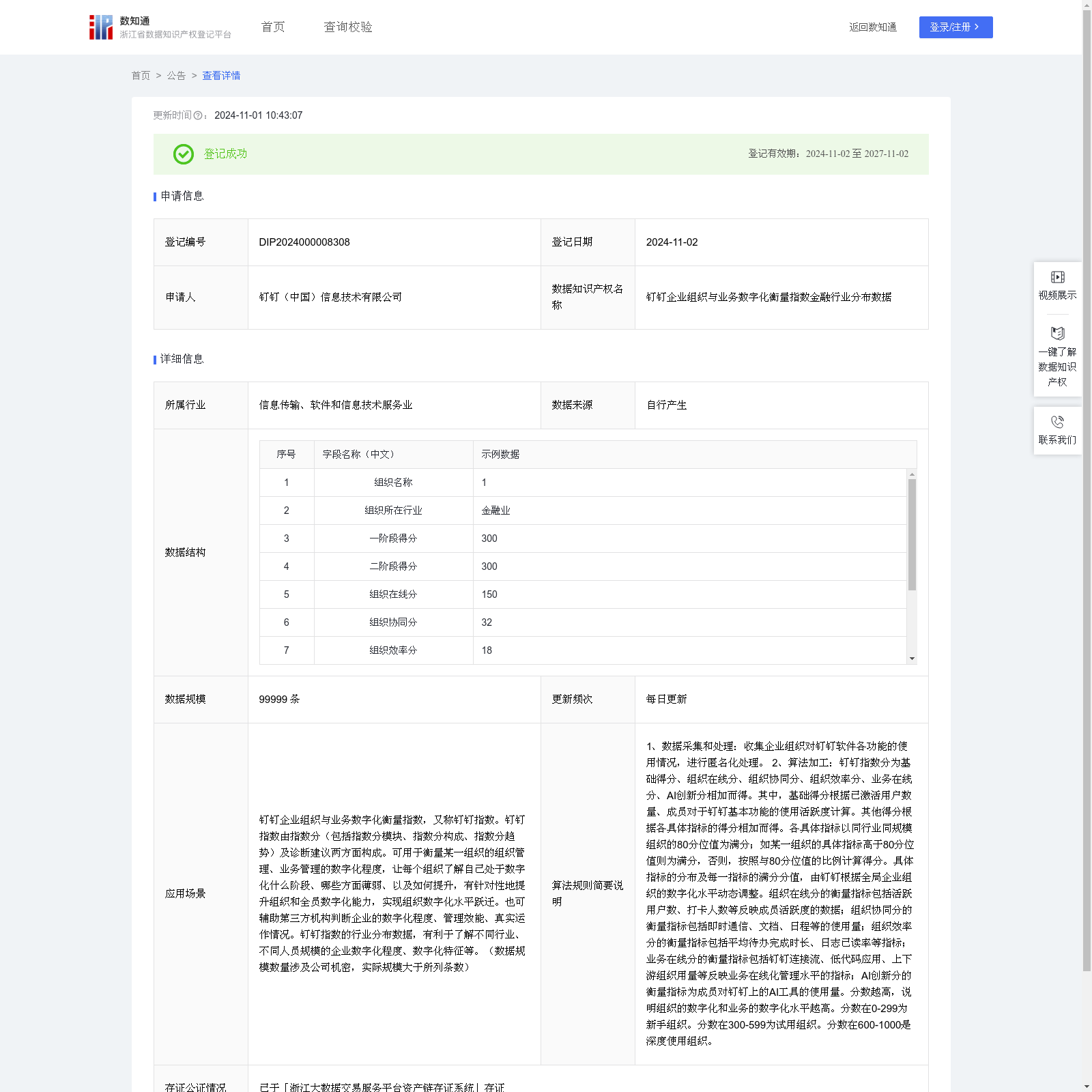 钉钉(中国)信息技术有限公司 本次登记的数据知识产权 钉钉企业组织与业务数字化衡量指数金融行业分布数据, 钉钉企业组织与业务数字化衡量指数,又称钉钉指数。钉钉指数由指数分(包括指数分模块、指数分构成、指数分趋势)及诊断建议两方面构成。可用于衡量某一组织的组织管理、业务管理的数字化程度,让每个组织了解自己处于数字化什么阶段、哪些方面薄弱、以及如何提升,有针对性地提升组织和全员数字化能力,实现组织数字化水平跃迁。也可辅助第三方机构判断企业的数字化程度、管理效能、真实运作情况。钉钉指数的行业分布数据,有利于了解不同行业、不同人员规模的企业数字化程度、数字化特征等。(数据规模数量涉及公司机密,实际规模大于所列条数)1、数据采集和处理:收集企业组织对钉钉软件各功能的使用情况,进行匿名化处理。 2、算法加工:钉钉指数分为基础得分、组织在线分、组织协同分、组织效率分、业务在线分、AI创新分相加而得。其中,基础得分根据已激活用户数量、成员对于钉钉基本功能的使用活跃度计算。其他得分根据各具体指标的得分相加而得。各具体指标以同行业同规模组织的80分位值为满分;如某一组织的具体指标高于80分位值则为满分,否则,按照与80分位值的比例计算得分。具体指标的分布及每一指标的满分分值,由钉钉根据全局企业组织的数字化水平动态调整。组织在线分的衡量指标包括活跃用户数、打卡人数等反映成员活跃度的数据;组织协同分的衡量指标包括即时通信、文档、日程等的使用量;组织效率分的衡量指标包括平均待办完成时长、日志已读率等指标;业务在线分的衡量指标包括钉钉连接流、低代码应用、上下游组织用量等反映业务在线化管理水平的指标;AI创新分的衡量指标为成员对钉钉上的AI工具的使用量。分数越高,说明组织的数字化和业务的数字化水平越高。分数在0-299为新手组织。分数在300-599为试用组织。分数在600-1000是深度使用组织。