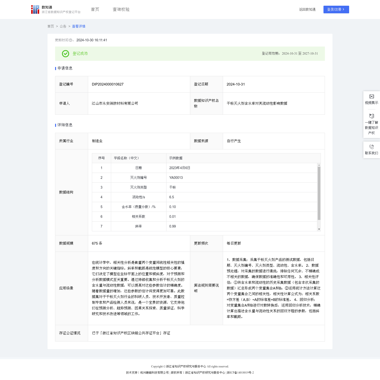 江山市永安消防材料有限公司 本次登记的数据知识产权 干粉灭火剂含水率对其流动性影响数据, 在统计学中,相关性分析是衡量两个变量间线性相关性的强度和方向的关键指标。斜率和截距是线性模型的核心要素,它们决定了模型在坐标平面上的位置和倾斜度,对于预测和分析数据模式至关重要。通过持续收集和分析干粉灭火剂的含水量与流动性数据,可以提高对这些参数估计的精确度。随着数据量的增加,这些参数的估计将变得更加可靠。此数据集对于干粉灭火剂行业的科研人员、技术开发者、质量控制专家和产品检测人员来说,是一个宝贵的资源,它支持他们在预测分析、趋势预测、因果关系探索、质量保证、科学研究和技术改进等领域的工作。1、数据采集:采集干粉灭火剂产品的测试数据,包括日期、灭火剂编号、灭火剂类型、流动性、含水率。 2、数据预处理:对采集的数据进行清洗,排除任何冗余、不精确或不相关的数据,确保数据的准确性和可用性。 3、相关性评估:①将含水率和流动性的历史采集数据(包含本次采集的数据)汇总形成两个变量集合A和B;②运用统计方法计算这两个变量集合之间的相关性,相关性计算公式为:相关系数=协方差(A,B)÷A的标准差×B的标准差。 4、回归分析:对变量集合A和B进行对数转换后,运用回归分析技术,精确计算出描述含水量与流动性关系的回归方程的参数,包括斜率和截距。