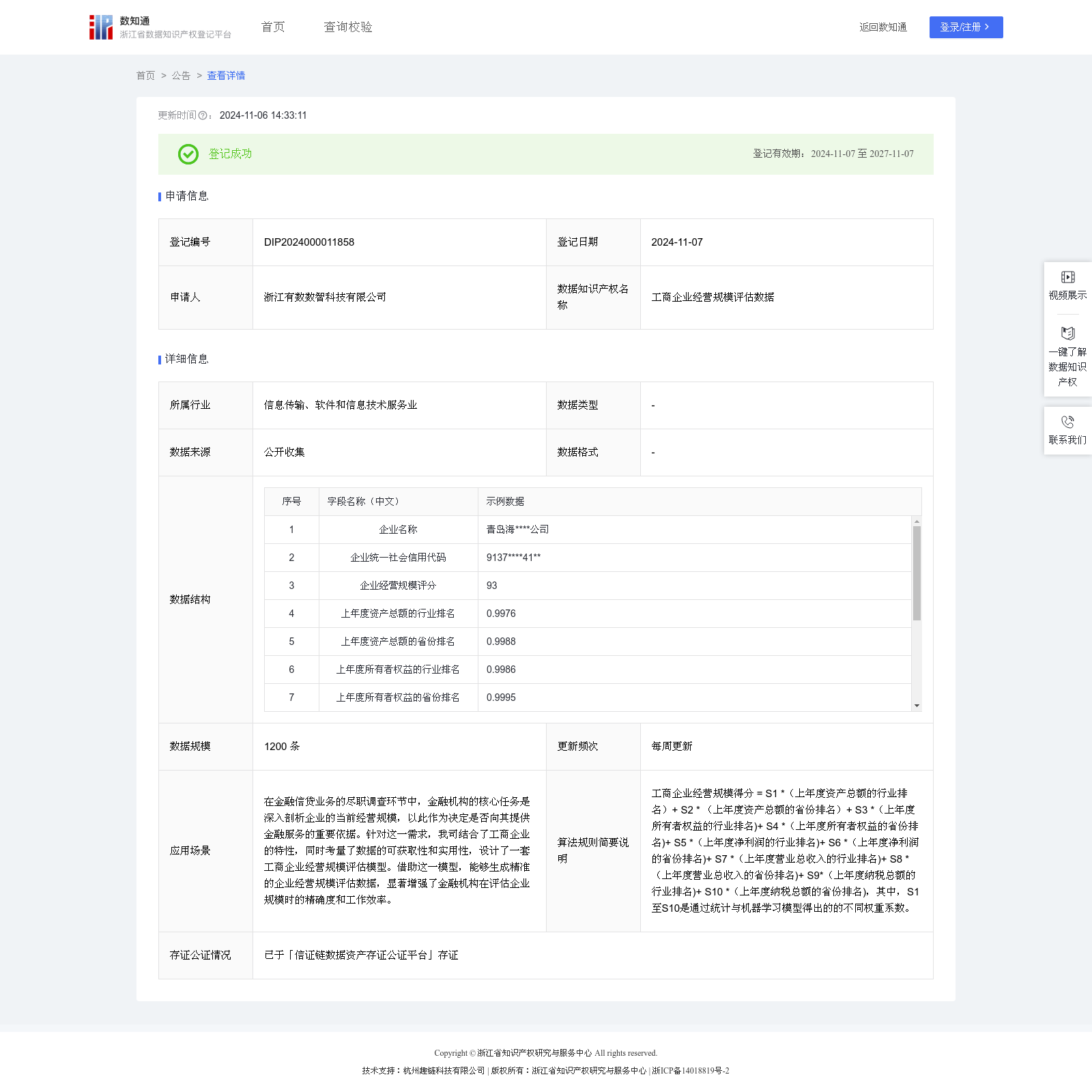 浙江有数数智科技有限公司 本次登记的数据知识产权 工商企业经营规模评估数据, 在金融信贷业务的尽职调查环节中,金融机构的核心任务是深入剖析企业的当前经营规模,以此作为决定是否向其提供金融服务的重要依据。针对这一需求,我司结合了工商企业的特性,同时考量了数据的可获取性和实用性,设计了一套工商企业经营规模评估模型。借助这一模型,能够生成精准的企业经营规模评估数据,显著增强了金融机构在评估企业规模时的精确度和工作效率。工商企业经营规模得分 = S1 *(上年度资产总额的行业排名)+ S2 * (上年度资产总额的省份排名)+ S3 *(上年度所有者权益的行业排名)+ S4 *(上年度所有者权益的省份排名)+ S5 *(上年度净利润的行业排名)+ S6 *(上年度净利润的省份排名)+ S7 *(上年度营业总收入的行业排名)+ S8 *(上年度营业总收入的省份排名)+ S9*(上年度纳税总额的行业排名)+ S10 *(上年度纳税总额的省份排名),其中,S1至S10是通过统计与机器学习模型得出的的不同权重系数。