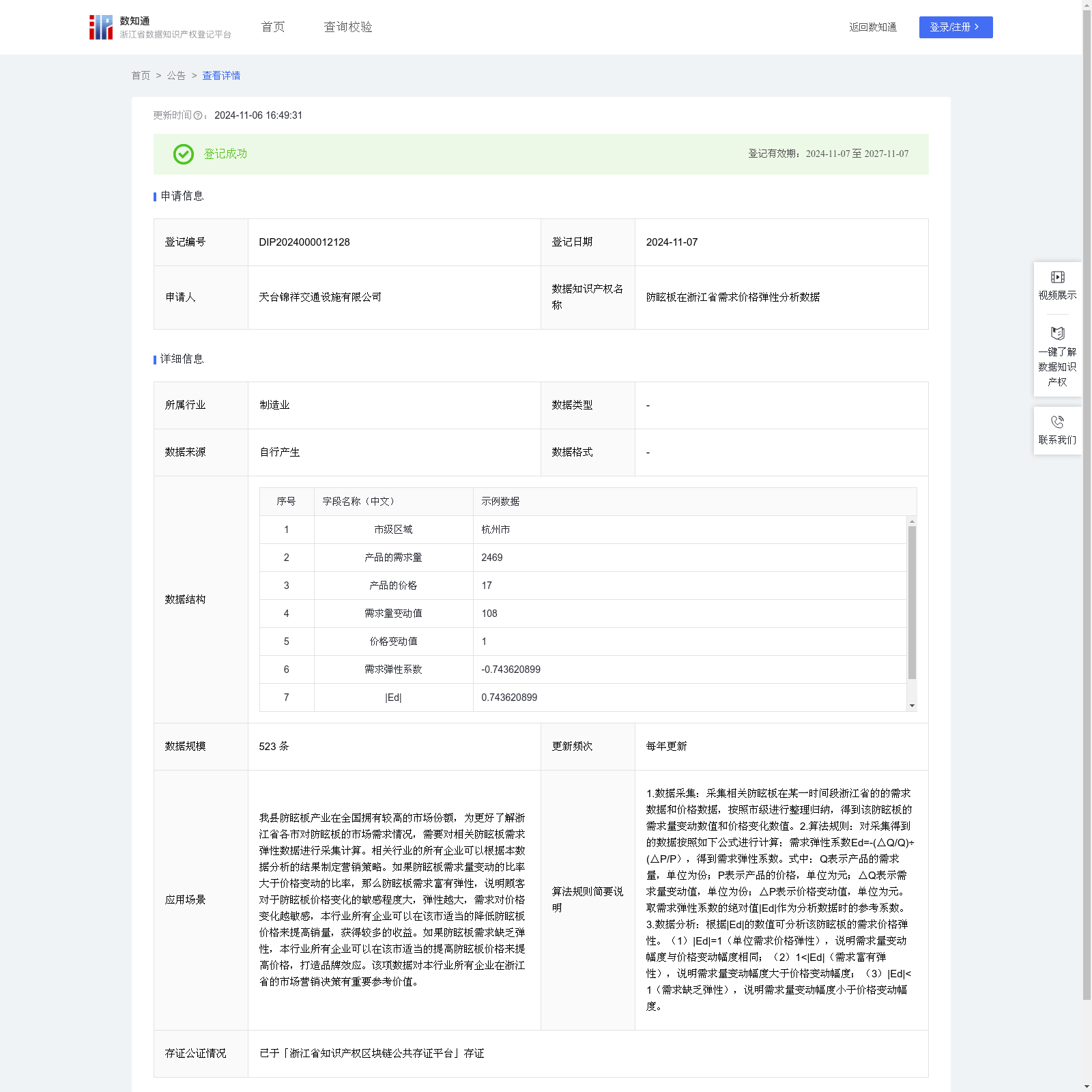 天台锦祥交通设施有限公司 本次登记的数据知识产权 防眩板在浙江省需求价格弹性分析数据, 我县防眩板产业在全国拥有较高的市场份额,为更好了解浙江省各市对防眩板的市场需求情况,需要对相关防眩板需求弹性数据进行采集计算。相关行业的所有企业可以根据本数据分析的结果制定营销策略。如果防眩板需求量变动的比率大于价格变动的比率,那么防眩板需求富有弹性,说明顾客对于防眩板价格变化的敏感程度大,弹性越大,需求对价格变化越敏感,本行业所有企业可以在该市适当的降低防眩板价格来提高销量,获得较多的收益。如果防眩板需求缺乏弹性,本行业所有企业可以在该市适当的提高防眩板价格来提高价格,打造品牌效应。该项数据对本行业所有企业在浙江省的市场营销决策有重要参考价值。1.数据采集:采集相关防眩板在某一时间段浙江省的的需求数据和价格数据,按照市级进行整理归纳,得到该防眩板的需求量变动数值和价格变化数值。2.算法规则:对采集得到的数据按照如下公式进行计算:需求弹性系数Ed=-(△Q/Q)÷(△P/P),得到需求弹性系数。式中:Q表示产品的需求量,单位为份;P表示产品的价格,单位为元;△Q表示需求量变动值,单位为份;△P表示价格变动值,单位为元。取需求弹性系数的绝对值|Ed|作为分析数据时的参考系数。 3.数据分析:根据|Ed|的数值可分析该防眩板的需求价格弹性。(1)|Ed|=1(单位需求价格弹性),说明需求量变动幅度与价格变动幅度相同;(2)1<|Ed|(需求富有弹性),说明需求量变动幅度大于价格变动幅度;(3)|Ed|<1(需求缺乏弹性),说明需求量变动幅度小于价格变动幅度。
