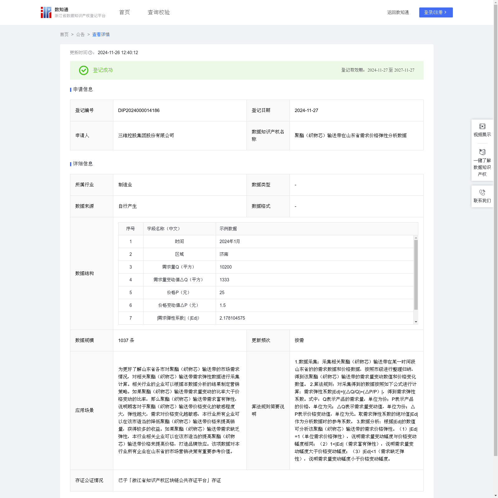 三维控股集团股份有限公司 本次登记的数据知识产权 聚酯(织物芯)输送带在山东省需求价格弹性分析数据, 为更好了解山东省各市对聚酯(织物芯)输送带的市场需求情况,对相关聚酯(织物芯)输送带需求弹性数据进行采集计算。相关行业的企业可以根据本数据分析的结果制定营销策略。如果聚酯(织物芯)输送带需求量变动的比率大于价格变动的比率,那么聚酯(织物芯)输送带需求富有弹性,说明顾客对于聚酯(织物芯)输送带价格变化的敏感程度大,弹性越大,需求对价格变化越敏感,本行业所有企业可以在该市适当的降低聚酯(织物芯)输送带价格来提高销量,获得较多的收益。如果聚酯(织物芯)输送带需求缺乏弹性,本行业相关企业可以在该市适当的提高聚酯(织物芯)输送带价格来提高价格,打造品牌效应。该项数据对本行业所有企业在山东省的市场营销决策有重要参考价值。1.数据采集:采集相关聚酯(织物芯)输送带在某一时间段山东省的的需求数据和价格数据,按照市级进行整理归纳,得到该聚酯(织物芯)输送带的需求量变动数值和价格变化数值。 2.算法规则:对采集得到的数据按照如下公式进行计算:需求弹性系数|Ed|=|(△Q/Q)÷(△P/P)|,得到需求弹性系数。式中:Q表示产品的需求量,单位为份;P表示产品的价格,单位为元;△Q表示需求量变动值,单位为份;△P表示价格变动值,单位为元。取需求弹性系数的绝对值|Ed|作为分析数据时的参考系数。 3.数据分析:根据|Ed|的数值可分析该聚酯(织物芯)输送带的需求价格弹性。(1)|Ed|=1(单位需求价格弹性),说明需求量变动幅度与价格变动幅度相同;(2)1<|Ed|(需求富有弹性),说明需求量变动幅度大于价格变动幅度;(3)|Ed|<1(需求缺乏弹性),说明需求量变动幅度小于价格变动幅度。
