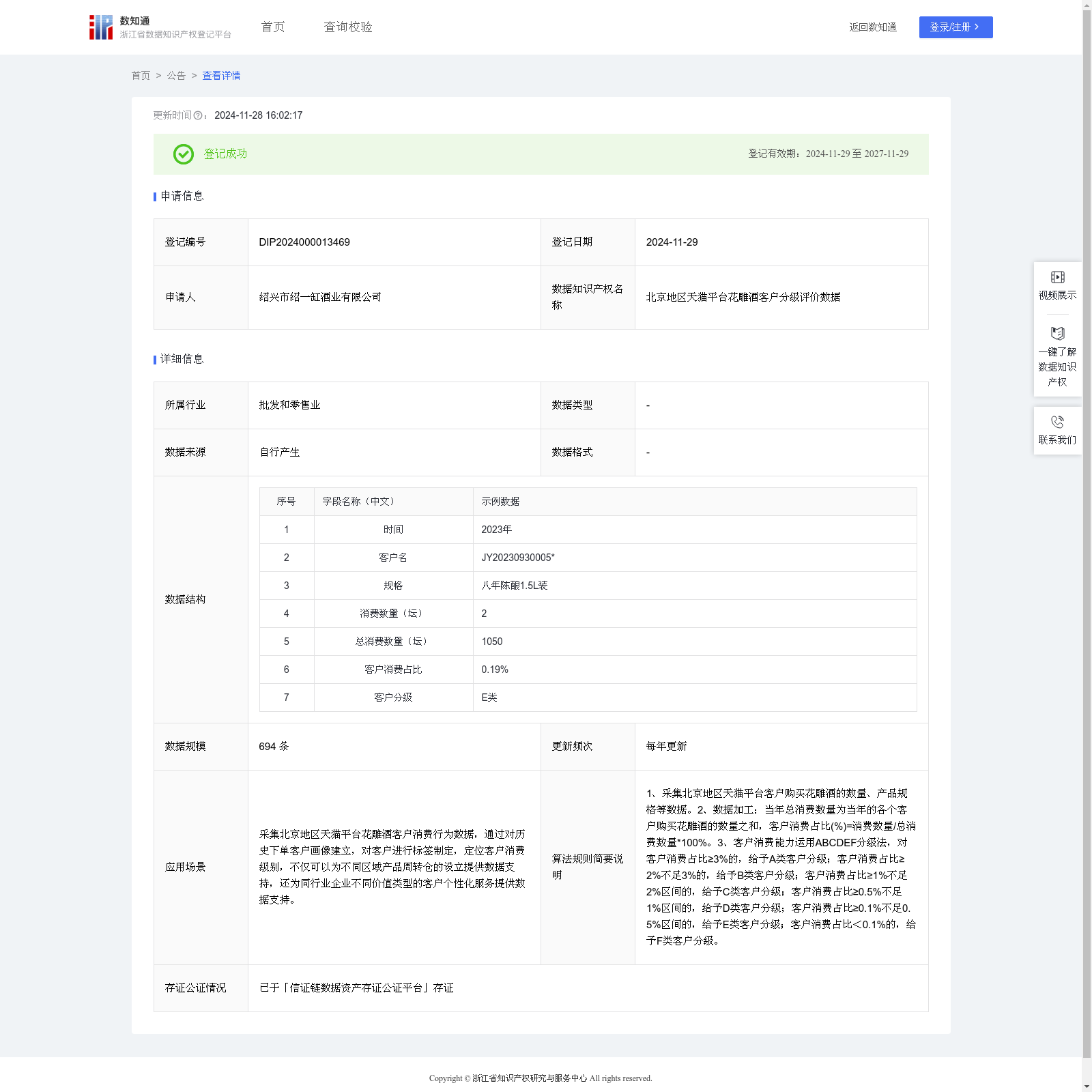绍兴市绍一缸酒业有限公司 本次登记的数据知识产权 北京地区天猫平台花雕酒客户分级评价数据, 采集北京地区天猫平台花雕酒客户消费行为数据,通过对历史下单客户画像建立,对客户进行标签制定,定位客户消费级别,不仅可以为不同区域产品周转仓的设立提供数据支持,还为同行业企业不同价值类型的客户个性化服务提供数据支持。1、采集北京地区天猫平台客户购买花雕酒的数量、产品规格等数据。2、数据加工:当年总消费数量为当年的各个客户购买花雕酒的数量之和,客户消费占比(%)=消费数量/总消费数量*100%。3、客户消费能力运用ABCDEF分级法,对客户消费占比≥3%的,给予A类客户分级;客户消费占比≥2%不足3%的,给予B类客户分级;客户消费占比≥1%不足2%区间的,给予C类客户分级;客户消费占比≥0.5%不足1%区间的,给予D类客户分级;客户消费占比≥0.1%不足0.5%区间的,给予E类客户分级;客户消费占比<0.1%的,给予F类客户分级。