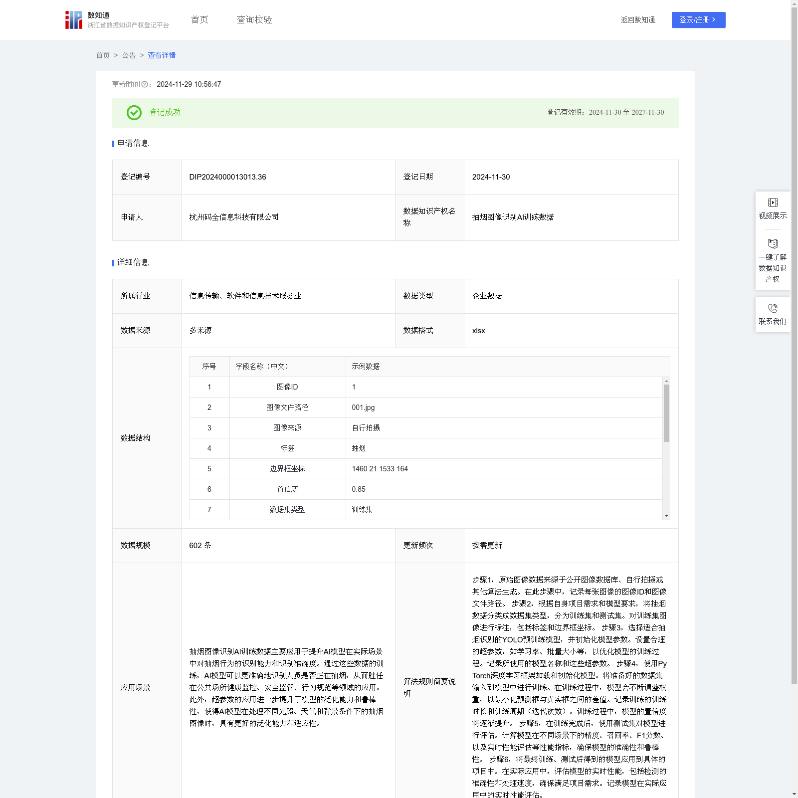杭州码全信息科技有限公司 本次登记的数据知识产权 抽烟图像识别AI训练数据, 抽烟图像识别AI训练数据主要应用于提升AI模型在实际场景中对抽烟行为的识别能力和识别准确度。通过这些数据的训练,AI模型可以更准确地识别人员是否正在抽烟,从而胜任在公共场所健康监控、安全监管、行为规范等领域的应用。此外,超参数的应用进一步提升了模型的泛化能力和鲁棒性,使得AI模型在处理不同光照、天气和背景条件下的抽烟图像时,具有更好的泛化能力和适应性。步骤1,原始图像数据来源于公开图像数据库、自行拍摄或其他算法生成。在此步骤中,记录每张图像的图像ID和图像文件路径。 步骤2,根据自身项目需求和模型要求,将抽烟数据分类成数据集类型,分为训练集和测试集。对训练集图像进行标注,包括标签和边界框坐标。 步骤3,选择适合抽烟识别的YOLO预训练模型,并初始化模型参数。设置合理的超参数,如学习率、批量大小等,以优化模型的训练过程。记录所使用的模型名称和这些超参数。 步骤4,使用PyTorch深度学习框架加载和初始化模型。将准备好的数据集输入到模型中进行训练。在训练过程中,模型会不断调整权重,以最小化预测框与真实框之间的差值。记录训练的训练时长和训练周期(迭代次数)。训练过程中,模型的置信度将逐渐提升。 步骤5,在训练完成后,使用测试集对模型进行评估。计算模型在不同场景下的精度、召回率、F1分数、以及实时性能评估等性能指标,确保模型的准确性和鲁棒性。 步骤6,将最终训练、测试后得到的模型应用到具体的项目中。在实际应用中,评估模型的实时性能,包括检测的准确性和处理速度,确保满足项目需求。记录模型在实际应用中的实时性能评估。