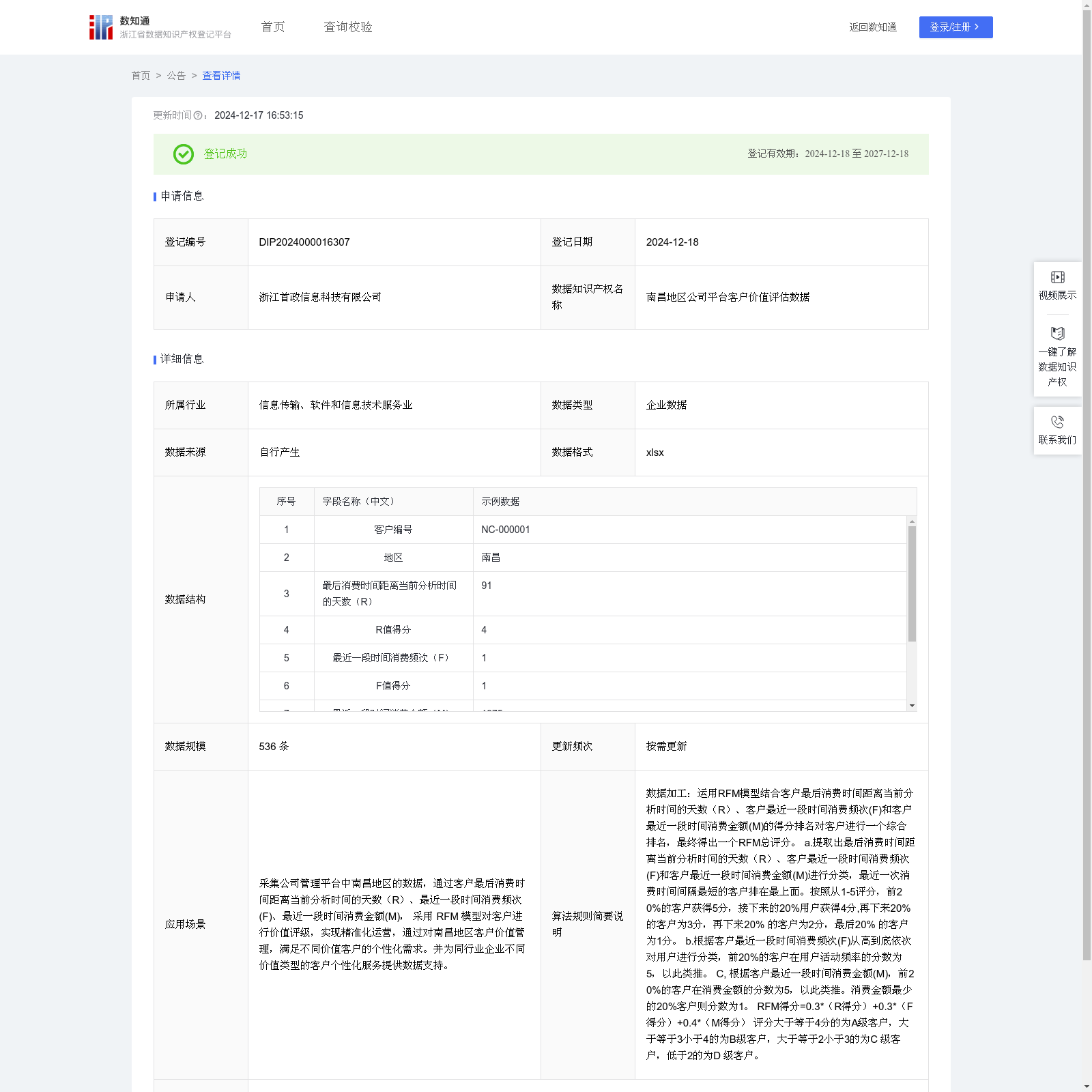 浙江首政信息科技有限公司 本次登记的数据知识产权 南昌地区公司平台客户价值评估数据, 采集公司管理平台中南昌地区的数据,通过客户最后消费时间距离当前分析时间的天数(R)、最近一段时间消费频次(F)、最近一段时间消费金额(M), 采用 RFM 模型对客户进行价值评级,实现精准化运营,通过对南昌地区客户价值管理,满足不同价值客户的个性化需求。并为同行业企业不同价值类型的客户个性化服务提供数据支持。数据加工:运用RFM模型结合客户最后消费时间距离当前分析时间的天数(R)、客户最近一段时间消费频次(F)和客户最近一段时间消费金额(M)的得分排名对客户进行一个综合排名,最终得出一个RFM总评分。 a.提取出最后消费时间距离当前分析时间的天数(R)、客户最近一段时间消费频次(F)和客户最近一段时间消费金额(M)进行分类,最近一次消费时间间隔最短的客户排在最上面。按照从1-5评分,前20%的客户获得5分,接下来的20%用户获得4分,再下来20%的客户为3分,再下来20% 的客户为2分,最后20% 的客户为1分。 b.根据客户最近一段时间消费频次(F)从高到底依次对用户进行分类,前20%的客户在用户活动频率的分数为5,以此类推。 C, 根据客户最近一段时间消费金额(M),前20%的客户在消费金额的分数为5,以此类推。消费金额最少的20%客户则分数为1。 RFM得分=0.3*(R得分)+0.3*(F得分)+0.4*(M得分) 评分大于等于4分的为A级客户,大于等于3小于4的为B级客户,大于等于2小于3的为C 级客户,低于2的为D 级客户。