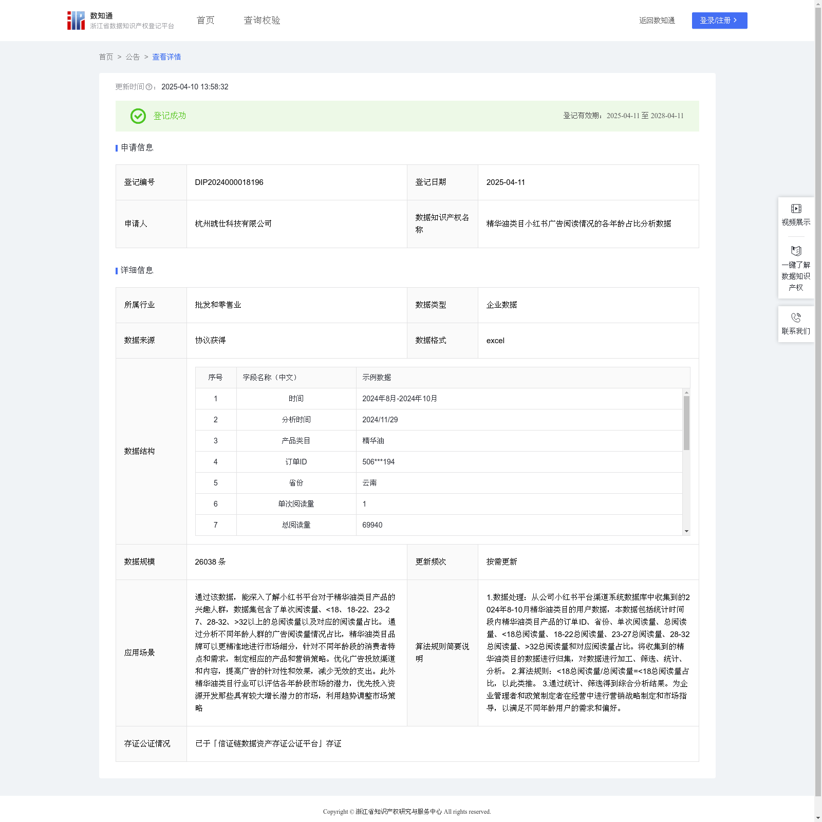 杭州琥仕科技有限公司 本次登记的数据知识产权 精华油类目小红书广告阅读情况的各年龄占比分析数据, 通过该数据,能深入了解小红书平台对于精华油类目产品的兴趣人群,数据集包含了单次阅读量、<18、18-22、23-27、28-32、>32以上的总阅读量以及对应的阅读量占比。 通过分析不同年龄人群的广告阅读量情况占比,精华油类目品牌可以更精准地进行市场细分,针对不同年龄段的消费者特点和需求,制定相应的产品和营销策略。优化广告投放渠道和内容,提高广告的针对性和效果,减少无效的支出。此外精华油类目行业可以评估各年龄段市场的潜力,优先投入资源开发那些具有较大增长潜力的市场,利用趋势调整市场策略 1.数据处理:从公司小红书平台渠道系统数据库中收集到的2024年8-10月精华油类目的用户数据,本数据包括统计时间段内精华油类目产品的订单ID、省份、单次阅读量、总阅读量、<18总阅读量、18-22总阅读量、23-27总阅读量、28-32总阅读量、>32总阅读量和对应阅读量占比。将收集到的精华油类目的数据进行归集,对数据进行加工、筛选、统计、分析。 2.算法规则:<18总阅读量/总阅读量=<18总阅读量占比,以此类推。 3.通过统计、筛选得到综合分析结果。为企业管理者和政策制定者在经营中进行营销战略制定和市场指导,以满足不同年龄用户的需求和偏好。