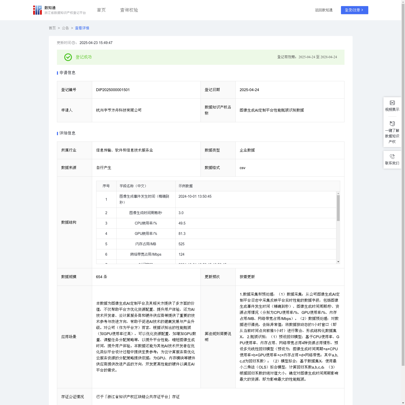 杭州字节方舟科技有限公司 本次登记的数据知识产权 图像生成AI定制平台性能瓶颈识别数据, 本数据为图像生成AI定制平台及其相关方提供了多方面的价值,不仅帮助平台方优化资源配置、提升用户体验,还为AI技术开发者、云计算服务商和硬件供应商等提供了重要的技术参考与改进方向,有助于促进AI技术的健康发展与产业升级。对公司(作为平台方)而言,根据识别出的性能瓶颈(如GPU使用率过高),可以优化资源配置,如增加GPU数量、调整任务分配策略等,以提升平台性能,缩短图像生成时间,提升用户体验。本数据还能为其他AI技术开发者在优化类似平台设计过程中提供宝贵参考;为云计算服务商优化云服务资源的分配策略提供依据;为GPU、内存模块等硬件供应商提供改进产品的方向,开发更高性能的硬件以满足AI平台的需求。1.数据采集和预处理:(1)数据采集:从公司图像生成AI定制平台日志中采集反映平台实时性能的数据字段,包括图像生成事件发生时间(精确到秒)、图像生成时间周期/秒、资源占用情况(分别为CPU使用率/%、GPU使用率/%、内存占用/MB、网络带宽占用/Mbps)。(2)数据预处理:对数据进行清洗,去除异常值;将数据按动态的1小时窗口(即从当前时间点向前推1小时)进行聚合,形成结构化数据集X。 2.瓶颈识别:(1)预设回归模型:基于CPU使用率、GPU使用率、内存占用、网络带宽占用4种资源占用情形,预设多元线性回归模型(预设为:图像生成时间周期=a×CPU使用率+b×GPU使用率+c×内存占用+d×网络带宽;其中a,b,c,d为回归系数);(2)模型拟合:基于数据集X,使用最小二乘法(OLS)拟合模型,计算回归系数a,b,c,d;(3)根据回归系数的绝对值大小,确定对图像生成时间周期影响最大的资源,即为影响最大的性能瓶颈。