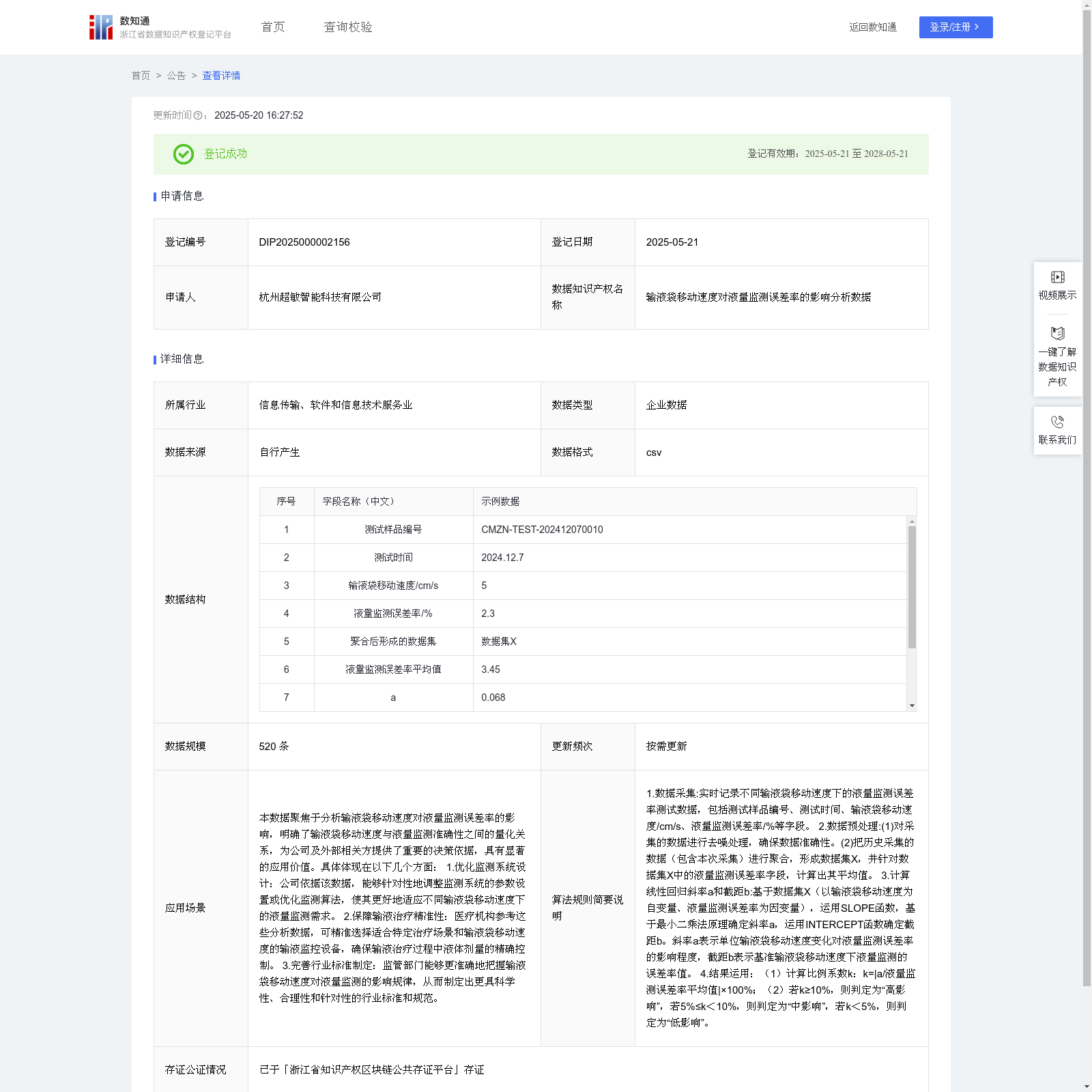杭州超敏智能科技有限公司 本次登记的数据知识产权 输液袋移动速度对液量监测误差率的影响分析数据, 本数据聚焦于分析输液袋移动速度对液量监测误差率的影响,明确了输液袋移动速度与液量监测准确性之间的量化关系,为公司及外部相关方提供了重要的决策依据,具有显著的应用价值。具体体现在以下几个方面: 1.优化监测系统设计:公司依据该数据,能够针对性地调整监测系统的参数设置或优化监测算法,使其更好地适应不同输液袋移动速度下的液量监测需求。 2.保障输液治疗精准性:医疗机构参考这些分析数据,可精准选择适合特定治疗场景和输液袋移动速度的输液监控设备,确保输液治疗过程中液体剂量的精确控制。 3.完善行业标准制定:监管部门能够更准确地把握输液袋移动速度对液量监测的影响规律,从而制定出更具科学性、合理性和针对性的行业标准和规范。1.数据采集:实时记录不同输液袋移动速度下的液量监测误差率测试数据,包括测试样品编号、测试时间、输液袋移动速度/cm/s、液量监测误差率/%等字段。 2.数据预处理:(1)对采集的数据进行去噪处理,确保数据准确性。(2)把历史采集的数据(包含本次采集)进行聚合,形成数据集X,并针对数据集X中的液量监测误差率字段,计算出其平均值。 3.计算线性回归斜率a和截距b:基于数据集X(以输液袋移动速度为自变量、液量监测误差率为因变量),运用SLOPE函数,基于最小二乘法原理确定斜率a,运用INTERCEPT函数确定截距b。斜率a表示单位输液袋移动速度变化对液量监测误差率的影响程度,截距b表示基准输液袋移动速度下液量监测的误差率值。 4.结果运用:(1)计算比例系数k:k=|a/液量监测误差率平均值|×100%;(2)若k≥10%,则判定为“高影响”,若5%≤k<10%,则判定为“中影响”,若k<5%,则判定为“低影响”。