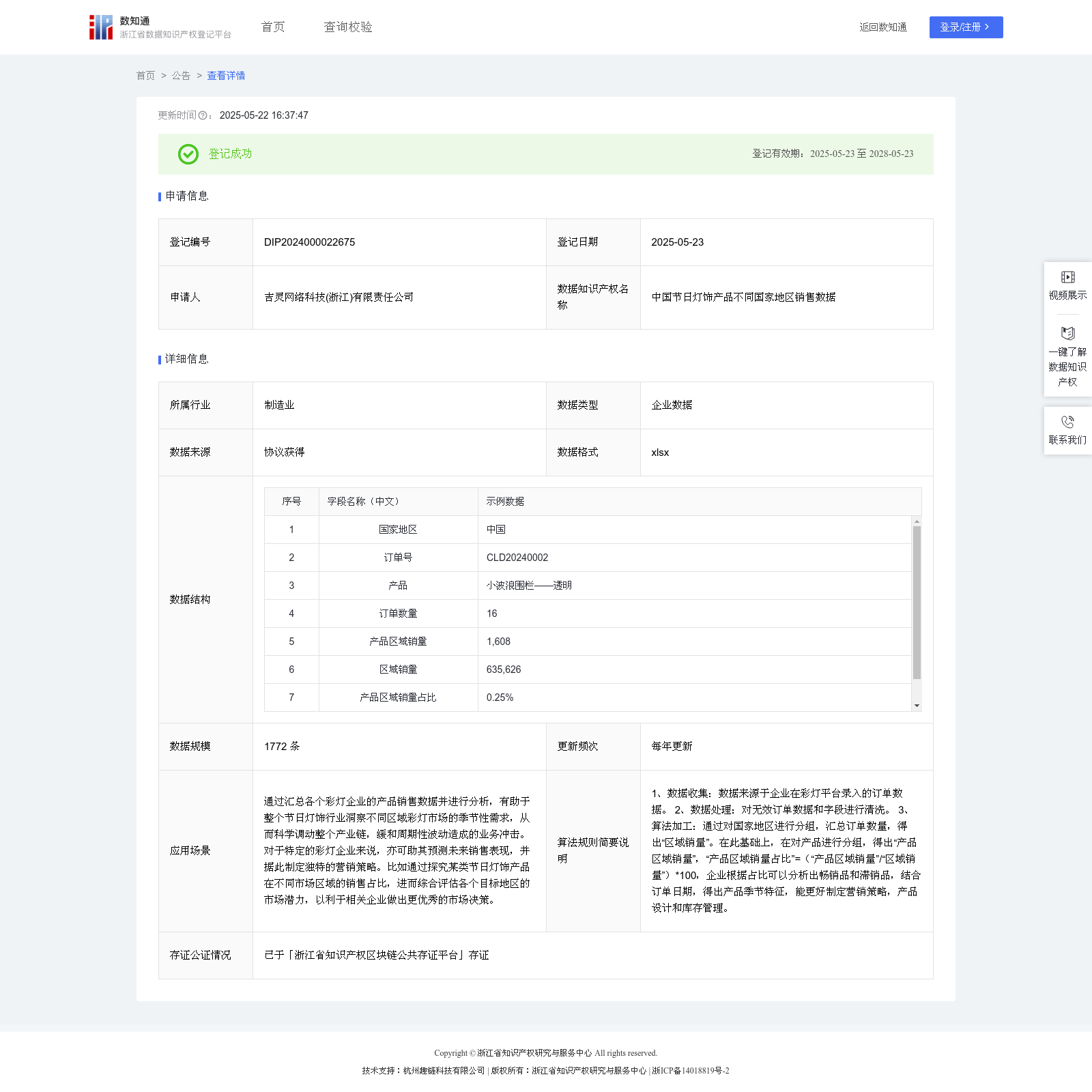 吉灵网络科技(浙江)有限责任公司 本次登记的数据知识产权 中国节日灯饰产品不同国家地区销售数据, 通过汇总各个彩灯企业的产品销售数据并进行分析,有助于整个节日灯饰行业洞察不同区域彩灯市场的季节性需求,从而科学调动整个产业链,缓和周期性波动造成的业务冲击。对于特定的彩灯企业来说,亦可助其预测未来销售表现,并据此制定独特的营销策略。比如通过探究某类节日灯饰产品在不同市场区域的销售占比,进而综合评估各个目标地区的市场潜力,以利于相关企业做出更优秀的市场决策。1、数据收集:数据来源于企业在彩灯平台录入的订单数据。 2、数据处理:对无效订单数据和字段进行清洗。 3、算法加工:通过对国家地区进行分组,汇总订单数量,得出“区域销量”。在此基础上,在对产品进行分组,得出“产品区域销量”,“产品区域销量占比”=(“产品区域销量”/“区域销量”)*100,企业根据占比可以分析出畅销品和滞销品,结合订单日期,得出产品季节特征,能更好制定营销策略,产品设计和库存管理。