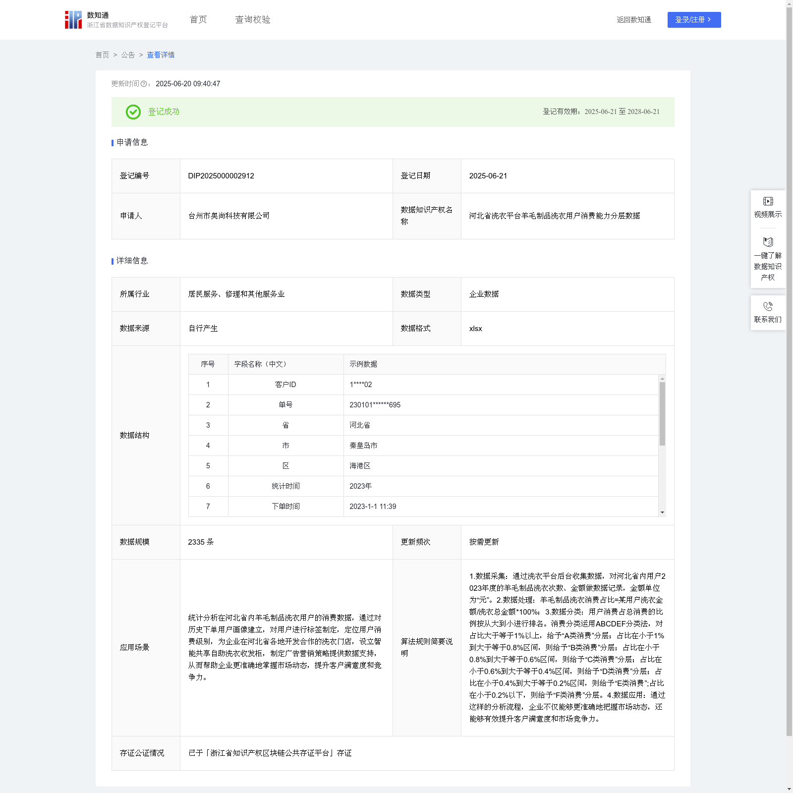 台州市奥尚科技有限公司 本次登记的数据知识产权 河北省洗衣平台羊毛制品洗衣用户消费能力分层数据, 统计分析在河北省内羊毛制品洗衣用户的消费数据,通过对历史下单用户画像建立,对用户进行标签制定,定位用户消费级别,为企业在河北省各地开发合作的洗衣门店,设立智能共享自助洗衣收发柜,制定广告营销策略提供数据支持,从而帮助企业更准确地掌握市场动态,提升客户满意度和竞争力。1.数据采集:通过洗衣平台后台收集数据,对河北省内用户2023年度的羊毛制品洗衣次数、金额做数据记录,金额单位为“元”。2.数据处理:羊毛制品洗衣消费占比=某用户洗衣金额/洗衣总金额*100%;3.数据分类:用户消费占总消费的比例按从大到小进行排名。消费分类运用ABCDEF分类法,对占比大于等于1%以上,给予“A类消费”分层;占比在小于1%到大于等于0.8%区间,则给予“B类消费”分层;占比在小于0.8%到大于等于0.6%区间,则给予“C类消费”分层;占比在小于0.6%到大于等于0.4%区间,则给予“D类消费”分层;占比在小于0.4%到大于等于0.2%区间,则给予“E类消费”;占比在小于0.2%以下,则给予“F类消费”分层。4.数据应用:通过这样的分析流程,企业不仅能够更准确地把握市场动态,还能够有效提升客户满意度和市场竞争力。