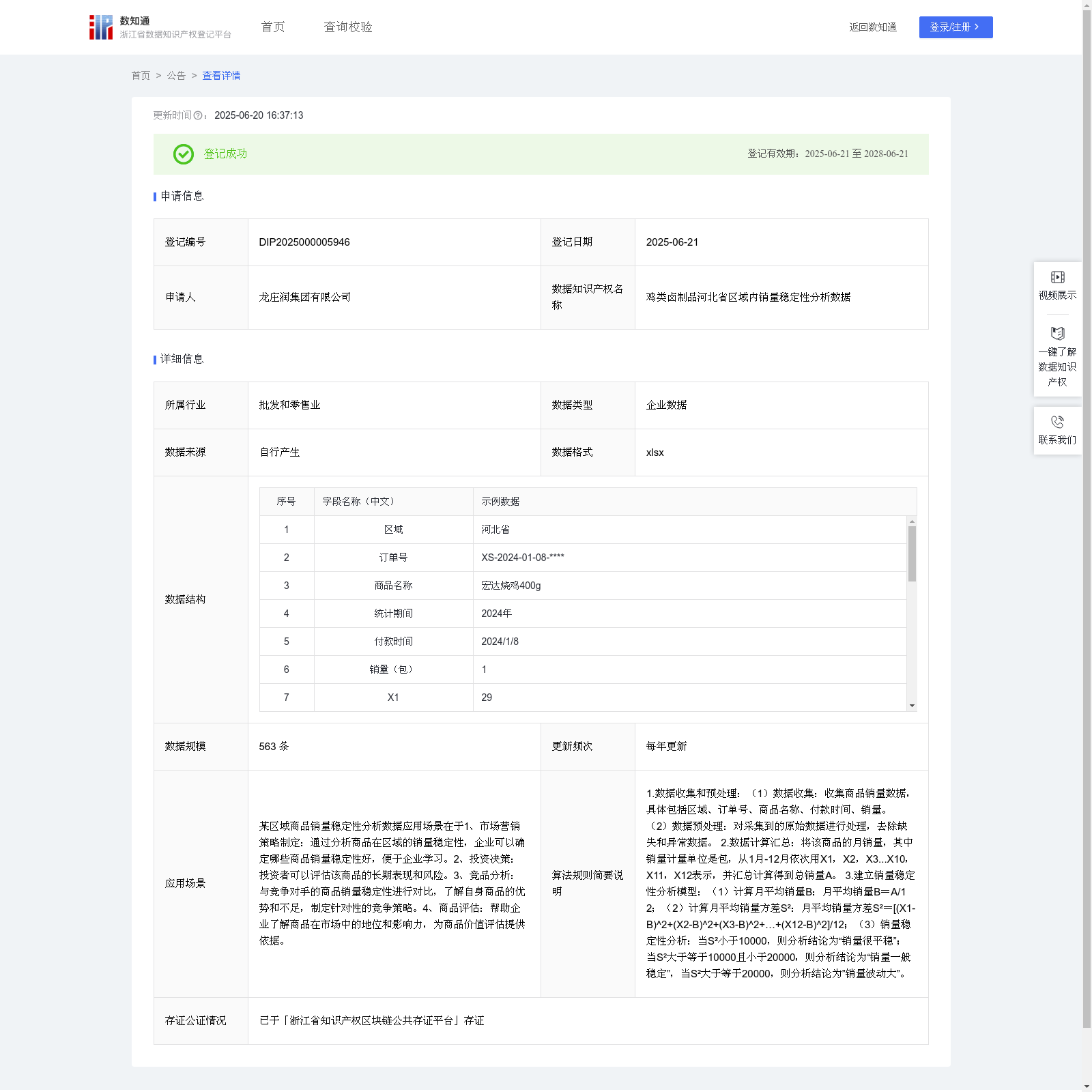 龙庄润集团有限公司 本次登记的数据知识产权 鸡类卤制品河北省区域内销量稳定性分析数据, 某区域商品销量稳定性分析数据应用场景在于1、市场营销策略制定:通过分析商品在区域的销量稳定性,企业可以确定哪些商品销量稳定性好,便于企业学习。2、投资决策:投资者可以评估该商品的长期表现和风险。3、竞品分析:与竞争对手的商品销量稳定性进行对比,了解自身商品的优势和不足,制定针对性的竞争策略。4、商品评估:帮助企业了解商品在市场中的地位和影响力,为商品价值评估提供依据。 1.数据收集和预处理:(1)数据收集:收集商品销量数据,具体包括区域、订单号、商品名称、付款时间、销量。(2)数据预处理:对采集到的原始数据进行处理,去除缺失和异常数据。 2.数据计算汇总:将该商品的月销量,其中销量计量单位是包,从1月-12月依次用X1,X2,X3...X10,X11,X12表示,并汇总计算得到总销量A。 3.建立销量稳定性分析模型:(1)计算月平均销量B:月平均销量B=A/12;(2)计算月平均销量方差S²:月平均销量方差S²=[(X1-B)^2+(X2-B)^2+(X3-B)^2+…+(X12-B)^2]/12;(3)销量稳定性分析:当S²小于10000,则分析结论为“销量很平稳”;当S²大于等于10000且小于20000,则分析结论为“销量一般稳定”,当S²大于等于20000,则分析结论为”销量波动大”。