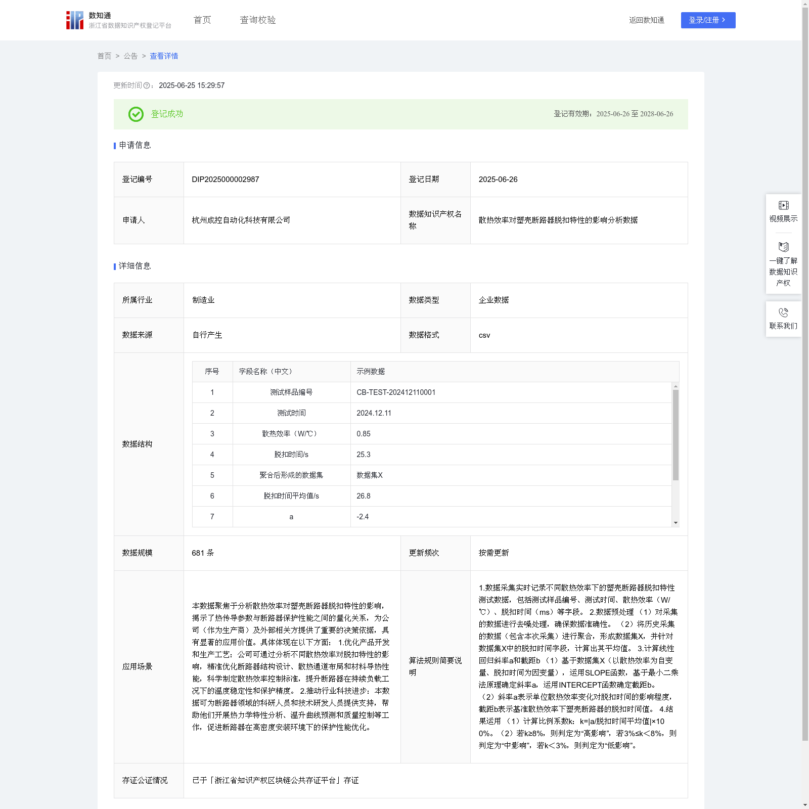 杭州成控自动化科技有限公司 本次登记的数据知识产权 散热效率对塑壳断路器脱扣特性的影响分析数据, 本数据聚焦于分析散热效率对塑壳断路器脱扣特性的影响,揭示了热传导参数与断路器保护性能之间的量化关系,为公司(作为生产商)及外部相关方提供了重要的决策依据,具有显著的应用价值。具体体现在以下方面: 1.优化产品开发和生产工艺:公司可通过分析不同散热效率对脱扣特性的影响,精准优化断路器结构设计、散热通道布局和材料导热性能,科学制定散热效率控制标准,提升断路器在持续负载工况下的温度稳定性和保护精度。 2.推动行业科技进步:本数据可为断路器领域的科研人员和技术研发人员提供支持,帮助他们开展热力学特性分析、温升曲线预测和质量控制等工作,促进断路器在高密度安装环境下的保护性能优化。1.数据采集实时记录不同散热效率下的塑壳断路器脱扣特性测试数据,包括测试样品编号、测试时间、散热效率(W/℃)、脱扣时间(ms)等字段。 2.数据预处理 (1)对采集的数据进行去噪处理,确保数据准确性。 (2)将历史采集的数据(包含本次采集)进行聚合,形成数据集X,并针对数据集X中的脱扣时间字段,计算出其平均值。 3.计算线性回归斜率a和截距b (1)基于数据集X(以散热效率为自变量、脱扣时间为因变量),运用SLOPE函数,基于最小二乘法原理确定斜率a,运用INTERCEPT函数确定截距b。 (2)斜率a表示单位散热效率变化对脱扣时间的影响程度,截距b表示基准散热效率下塑壳断路器的脱扣时间值。 4.结果运用 (1)计算比例系数k:k=|a/脱扣时间平均值|×100%。(2)若k≥8%,则判定为“高影响”,若3%≤k<8%,则判定为“中影响”,若k<3%,则判定为“低影响”。