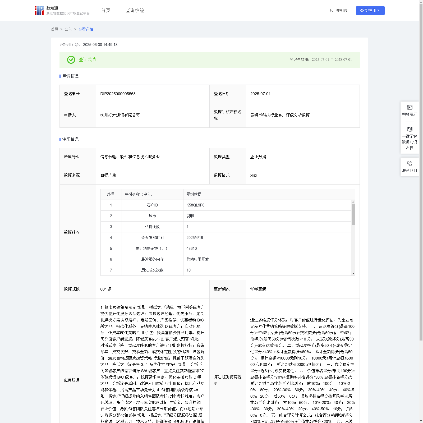 关于 浙江省数据知识产权登记平台 , 浙江省数据知识产权登记平台是一个专门用于登记和管理数据知识产权的官方平台。该平台允许企业和个人申请登记其数据知识产权,包括专利分类数据、客户价值评估数据等。平台提供公告功能,展示已登记、放弃或撤销的数据知识产权信息,并提供详细的申请人、申请时间和更新信息。