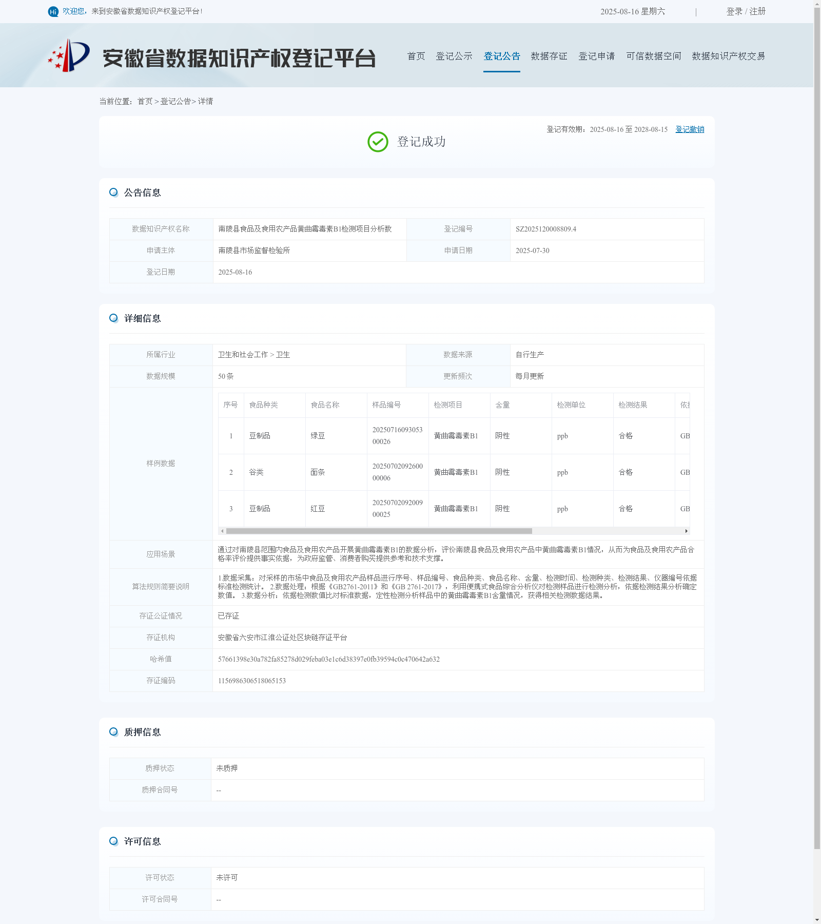 南陵县市场监督检验所 本次登记的数据知识产权 南陵县食品及食用农产品黄曲霉毒素B1检测项目分析数, 数据源自安徽省食品安全快速检测信息共享平台