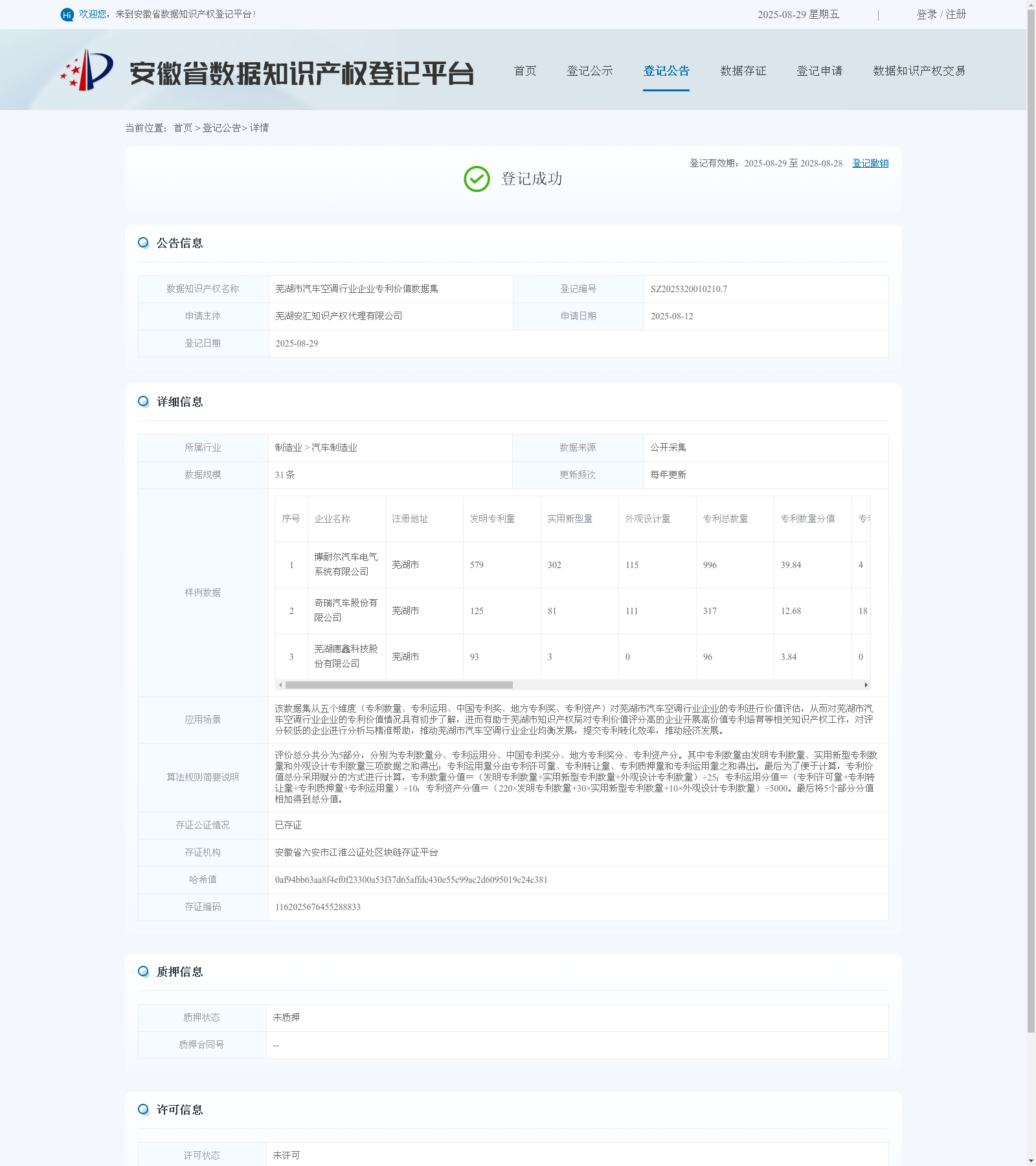 芜湖安汇知识产权代理有限公司 本次登记的数据知识产权 芜湖市汽车空调行业企业专利价值数据集, 数据均为国家知识产权局已公开专利内容信息,来源于国家知识产权局官方网站查询。