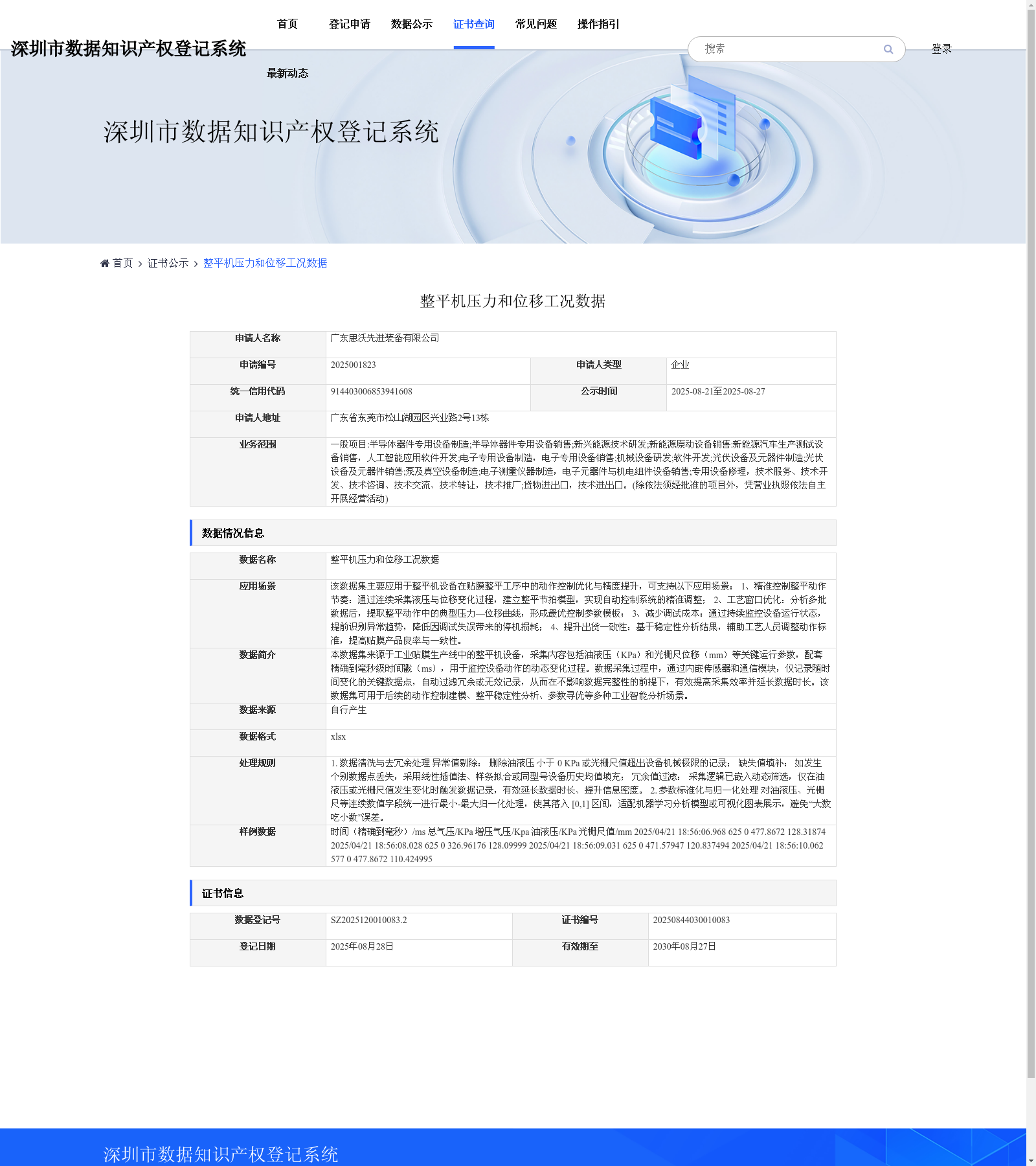 广东思沃先进装备有限公司 本次登记的数据知识产权 整平机压力和位移工况数据, 该数据集主要应用于整平机设备在贴膜整平工序中的动作控制优化与精度提升,可支持以下应用场景: 1、精准控制整平动作节奏:通过连续采集液压与位移变化过程,建立整平节拍模型,实现自动控制系统的精准调整; 2、工艺窗口优化:分析多批数据后,提取整平动作中的典型压力—位移曲线,形成最优控制参数模板; 3、减少调试成本:通过持续监控设备运行状态,提前识别异常趋势,降低因调试失误带来的停机损耗; 4、提升出货一致性:基于稳定性分析结果,辅助工艺人员调整动作标准,提高贴膜产品良率与一致性。