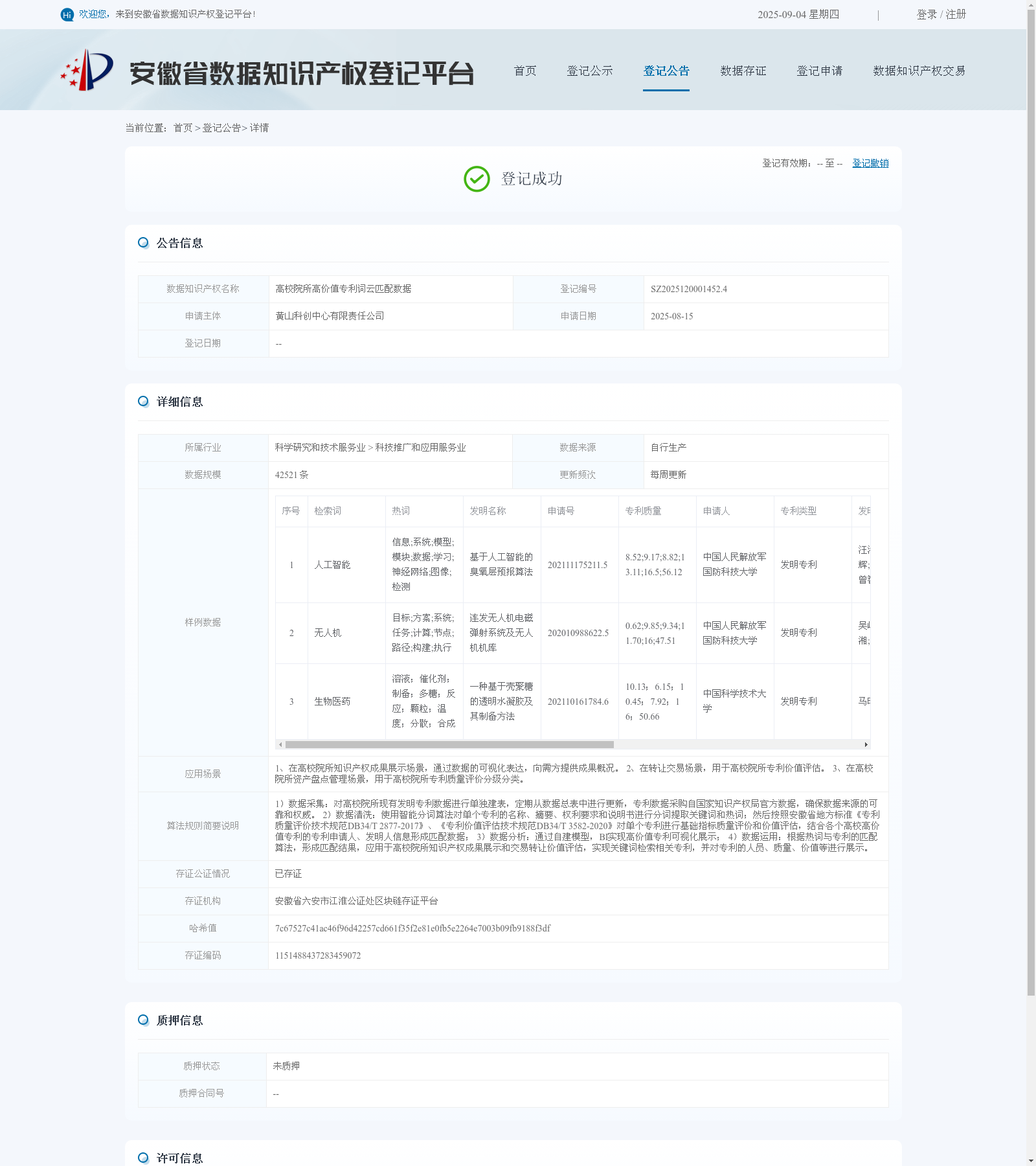 黄山科创中心有限责任公司 本次登记的数据知识产权 高校院所高价值专利词云匹配数据, 根据提取的关键词和热词,依托自有专利大数据资源,深度挖掘高校院所高价值专利涉及的技术要点、专利质量和价值详情和发明人信息展示为匹配数据,为高校院所提供知识产权成果和交易转让价值评估提供可视化展示和参考。