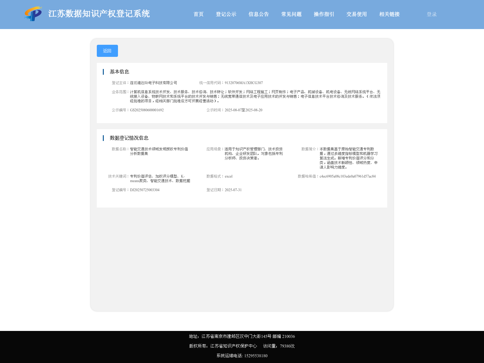 连云港达玲电子科技有限公司 本次登记的数据知识产权 智能交通技术领域发明授权专利价值分析数据集, 本数据集基于原始智能交通专利数据,通过多维度指标模型和机器学习算法生成。新增专利价值评分和分类,涵盖技术新颖性、领域热度、申请人影响力维度。