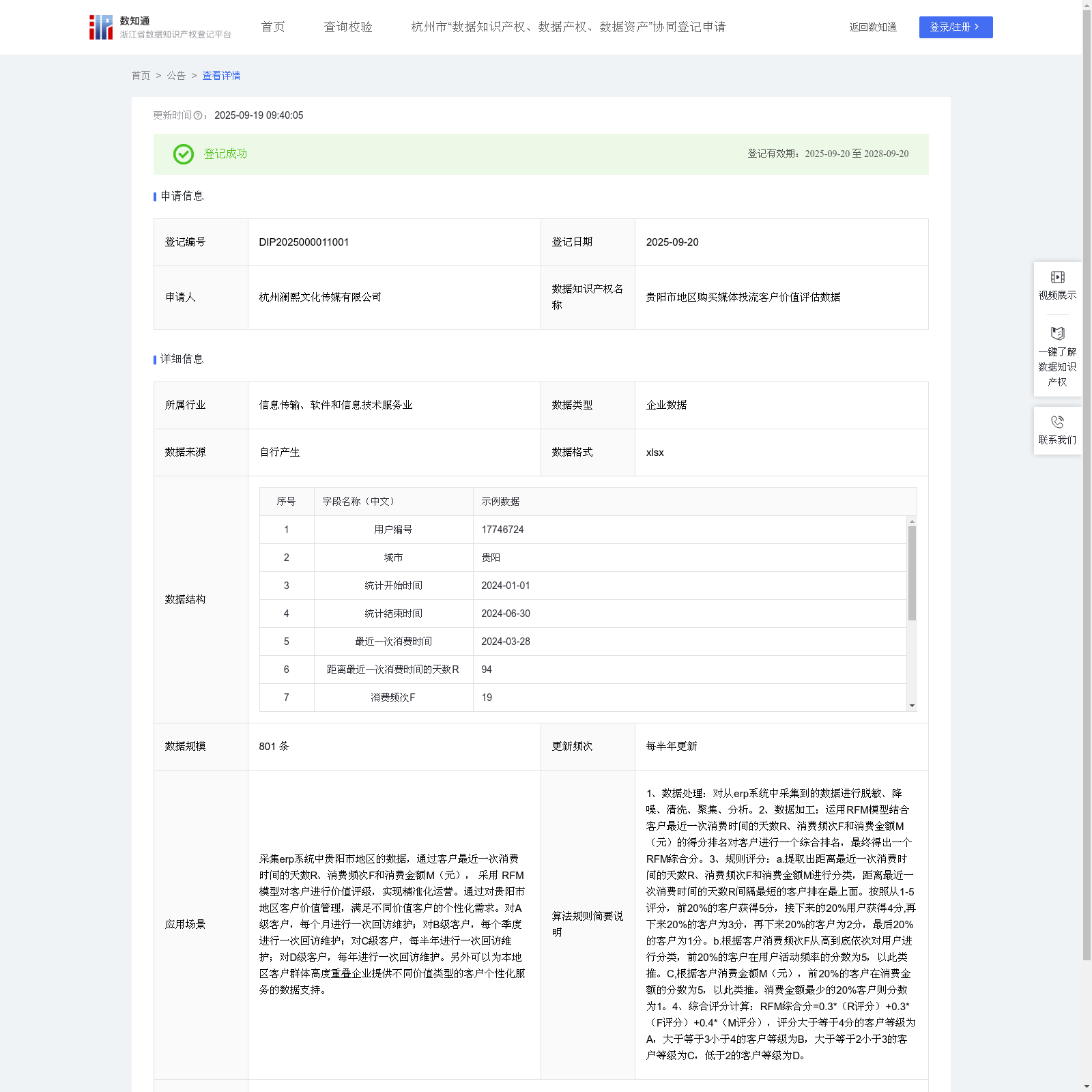 杭州澜熙文化传媒有限公司 本次登记的数据知识产权 贵阳市地区购买媒体投流客户价值评估数据, 采集erp系统中贵阳市地区的数据,通过客户最近一次消费时间的天数R、消费频次F和消费金额M(元), 采用 RFM 模型对客户进行价值评级,实现精准化运营。通过对贵阳市地区客户价值管理,满足不同价值客户的个性化需求。对A级客户,每个月进行一次回访维护;对B级客户,每个季度进行一次回访维护;对C级客户,每半年进行一次回访维护;对D级客户,每年进行一次回访维护。另外可以为本地区客户群体高度重叠企业提供不同价值类型的客户个性化服务的数据支持。 1、数据处理:对从erp系统中采集到的数据进行脱敏、降噪、清洗、聚集、分析。2、数据加工:运用RFM模型结合客户最近一次消费时间的天数R、消费频次F和消费金额M(元)的得分排名对客户进行一个综合排名,最终得出一个RFM综合分。3、规则评分:a.提取出距离最近一次消费时间的天数R、消费频次F和消费金额M进行分类,距离最近一次消费时间的天数R间隔最短的客户排在最上面。按照从1-5评分,前20%的客户获得5分,接下来的20%用户获得4分,再下来20%的客户为3分,再下来20%的客户为2分,最后20%的客户为1分。b.根据客户消费频次F从高到底依次对用户进行分类,前20%的客户在用户活动频率的分数为5,以此类推。C,根据客户消费金额M(元),前20%的客户在消费金额的分数为5,以此类推。消费金额最少的20%客户则分数为1。4、综合评分计算:RFM综合分=0.3*(R评分)+0.3*(F评分)+0.4*(M评分),评分大于等于4分的客户等级为A,大于等于3小于4的客户等级为B,大于等于2小于3的客户等级为C,低于2的客户等级为D。