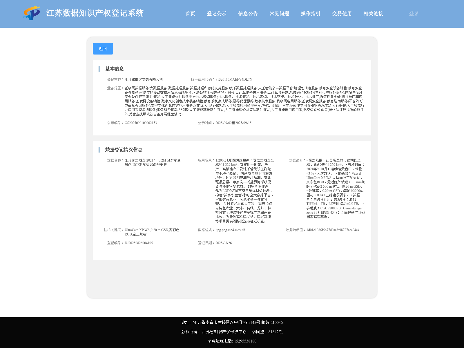 江苏领航大数据有限公司 本次登记的数据知识产权 江苏省建湖县 2021 年 0.2M 分辨率真彩色 UCXP 航摄影像数据集, • 覆盖范围:江苏省盐城市建湖县全域,总面积约1 229 km²。 • 获取时间:2021年9–10月(连续晴天窗口,云量<3 %,无雾霾)。 • 传感器:Vexcel UltraCam XP WA 大幅面数字航摄仪,真彩色RGB,无近红外波段;70 mm焦距,航高2 500 m 时实现0.20 m GSD。 • 分辨率:0.20 m GSD,满足1:2000成图与LOD2级三维建模要求。 • 数据量:单波段8-bit,共3波段;原始TIFF≈1.1 TB,LZW压缩后≈0.5 TB。 • 参考系:CGCS2000 / 3° Gauss-Kruger zone 39(EPSG:4548);高程基准1985国家高程基准。