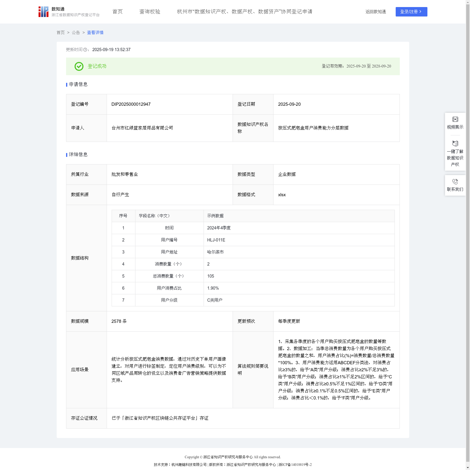 关于 浙江省数据知识产权登记平台 , 浙江省数据知识产权登记平台是一个专门用于登记和管理数据知识产权的官方平台。该平台允许企业和个人申请登记其数据知识产权,包括专利分类数据、客户价值评估数据等。平台提供公告功能,展示已登记、放弃或撤销的数据知识产权信息,并提供详细的申请人、申请时间和更新信息。