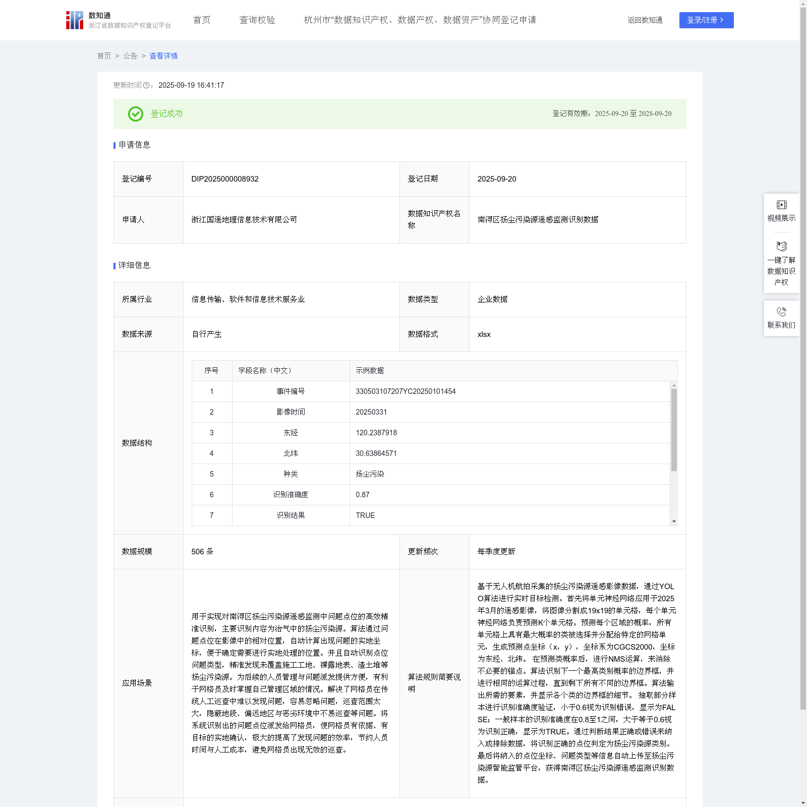 关于 浙江省数据知识产权登记平台 , 浙江省数据知识产权登记平台是一个专门用于登记和管理数据知识产权的官方平台。该平台允许企业和个人申请登记其数据知识产权,包括专利分类数据、客户价值评估数据等。平台提供公告功能,展示已登记、放弃或撤销的数据知识产权信息,并提供详细的申请人、申请时间和更新信息。