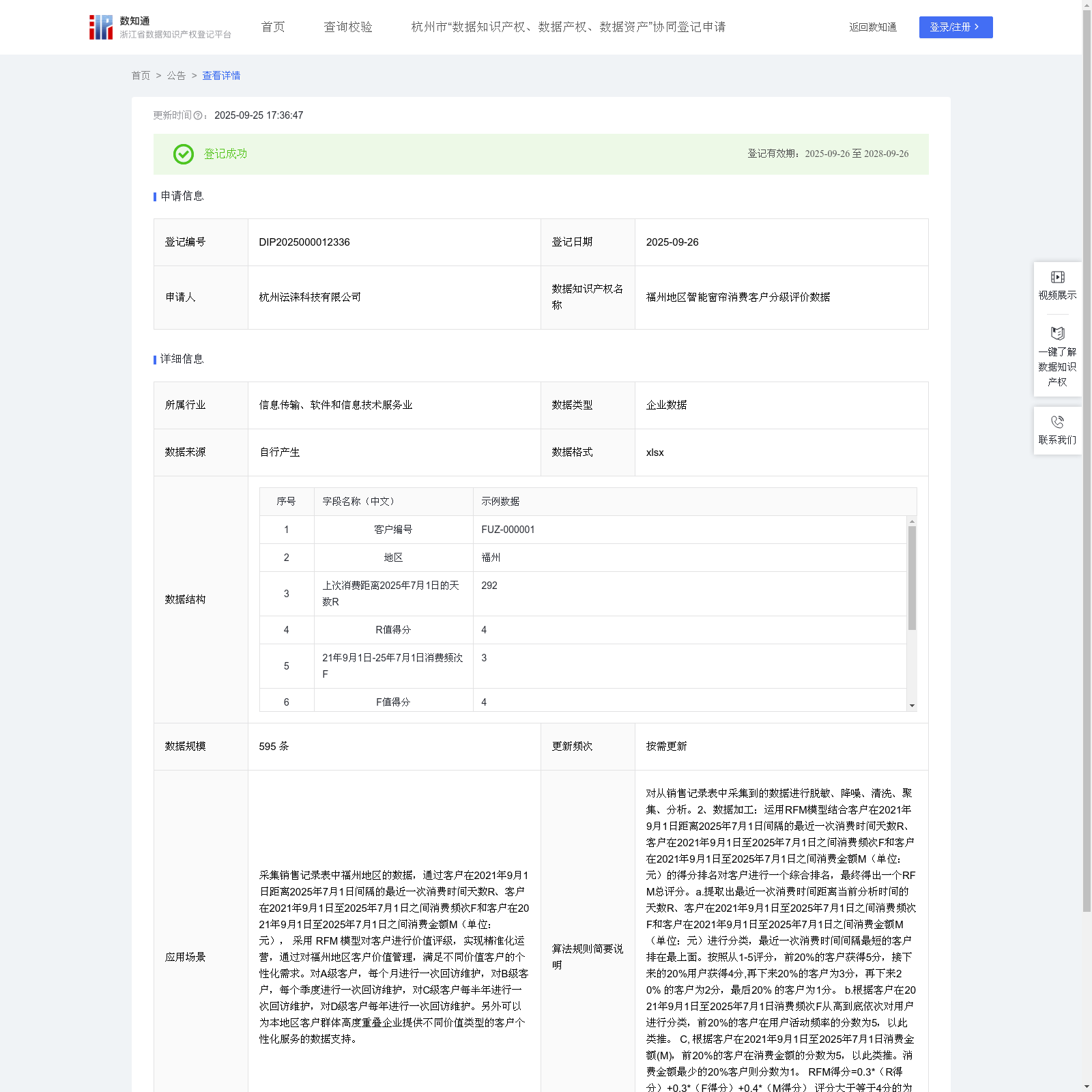 杭州沄涞科技有限公司 本次登记的数据知识产权 福州地区智能窗帘消费客户分级评价数据, 采集销售记录表中福州地区的数据,通过客户在2021年9月1日距离2025年7月1日间隔的最近一次消费时间天数R、客户在2021年9月1日至2025年7月1日之间消费频次F和客户在2021年9月1日至2025年7月1日之间消费金额M(单位:元), 采用 RFM 模型对客户进行价值评级,实现精准化运营,通过对福州地区客户价值管理,满足不同价值客户的个性化需求。对A级客户,每个月进行一次回访维护,对B级客户,每个季度进行一次回访维护,对C级客户每半年进行一次回访维护,对D级客户每年进行一次回访维护。另外可以为本地区客户群体高度重叠企业提供不同价值类型的客户个性化服务的数据支持。对从销售记录表中采集到的数据进行脱敏、降噪、清洗、聚集、分析。2、数据加工:运用RFM模型结合客户在2021年9月1日距离2025年7月1日间隔的最近一次消费时间天数R、客户在2021年9月1日至2025年7月1日之间消费频次F和客户在2021年9月1日至2025年7月1日之间消费金额M(单位:元)的得分排名对客户进行一个综合排名,最终得出一个RFM总评分。a.提取出最近一次消费时间距离当前分析时间的天数R、客户在2021年9月1日至2025年7月1日之间消费频次F和客户在2021年9月1日至2025年7月1日之间消费金额M(单位:元)进行分类,最近一次消费时间间隔最短的客户排在最上面。按照从1-5评分,前20%的客户获得5分,接下来的20%用户获得4分,再下来20%的客户为3分,再下来20% 的客户为2分,最后20% 的客户为1分。 b.根据客户在2021年9月1日至2025年7月1日消费频次F从高到底依次对用户进行分类,前20%的客户在用户活动频率的分数为5,以此类推。 C, 根据客户在2021年9月1日至2025年7月1日消费金额(M),前20%的客户在消费金额的分数为5,以此类推。消费金额最少的20%客户则分数为1。 RFM得分=0.3*(R得分)+0.3*(F得分)+0.4*(M得分) 评分大于等于4分的为A级客户,大于等于3小于4的为B级客户,大于等于2小于3的为C 级客户,低于2的为D级客户。