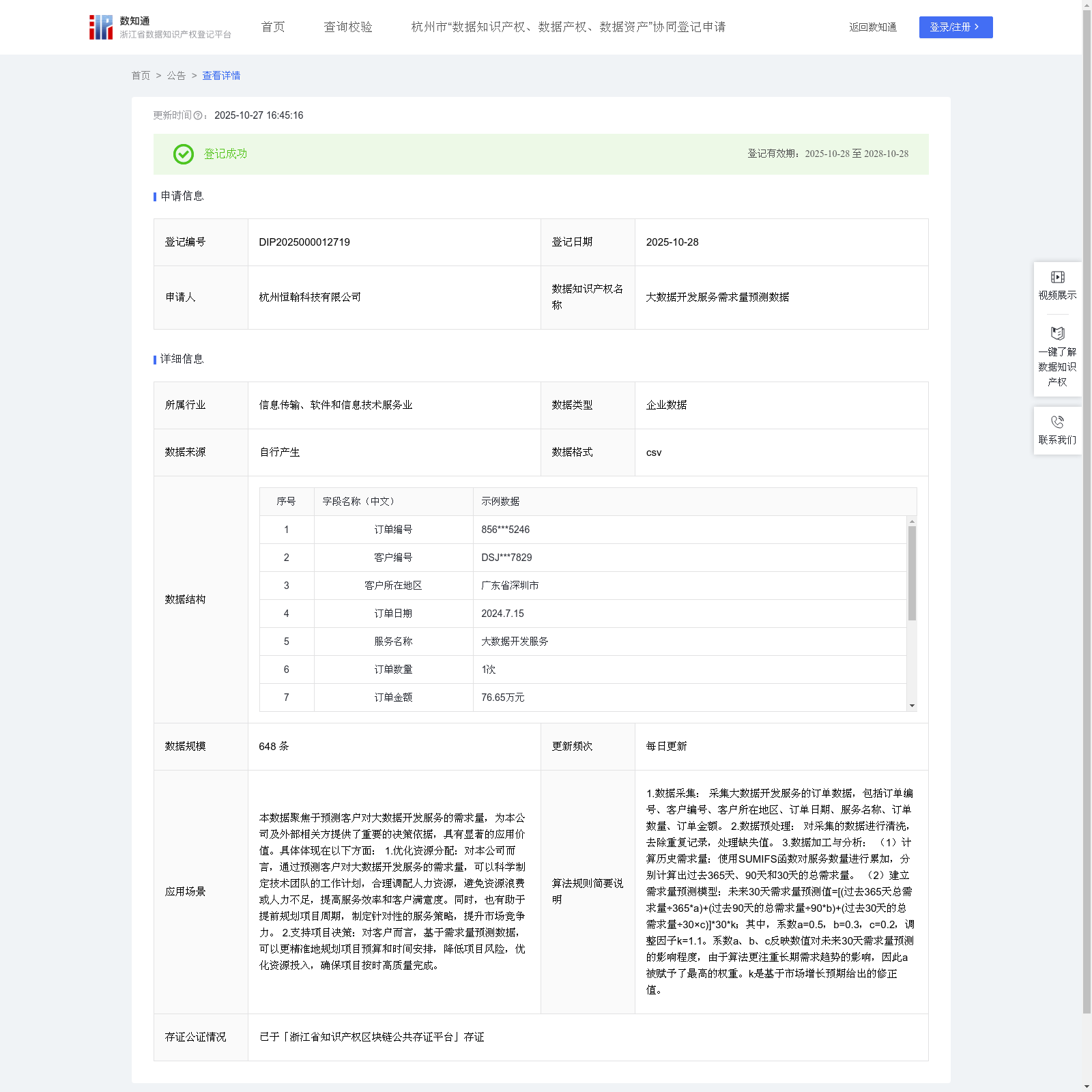 杭州恒翰科技有限公司 本次登记的数据知识产权 大数据开发服务需求量预测数据, 本数据聚焦于预测客户对大数据开发服务的需求量,为本公司及外部相关方提供了重要的决策依据,具有显著的应用价值。具体体现在以下方面: 1.优化资源分配:对本公司而言,通过预测客户对大数据开发服务的需求量,可以科学制定技术团队的工作计划,合理调配人力资源,避免资源浪费或人力不足,提高服务效率和客户满意度。同时,也有助于提前规划项目周期,制定针对性的服务策略,提升市场竞争力。 2.支持项目决策:对客户而言,基于需求量预测数据,可以更精准地规划项目预算和时间安排,降低项目风险,优化资源投入,确保项目按时高质量完成。1.数据采集: 采集大数据开发服务的订单数据,包括订单编号、客户编号、客户所在地区、订单日期、服务名称、订单数量、订单金额。 2.数据预处理: 对采集的数据进行清洗,去除重复记录,处理缺失值。 3.数据加工与分析: (1)计算历史需求量:使用SUMIFS函数对服务数量进行累加,分别计算出过去365天、90天和30天的总需求量。 (2)建立需求量预测模型:未来30天需求量预测值=[(过去365天总需求量÷365*a)+(过去90天的总需求量÷90*b)+(过去30天的总需求量÷30×c)]*30*k;其中,系数a=0.5,b=0.3,c=0.2,调整因子k=1.1。系数a、b、c反映数值对未来30天需求量预测的影响程度,由于算法更注重长期需求趋势的影响,因此a被赋予了最高的权重。k是基于市场增长预期给出的修正值。