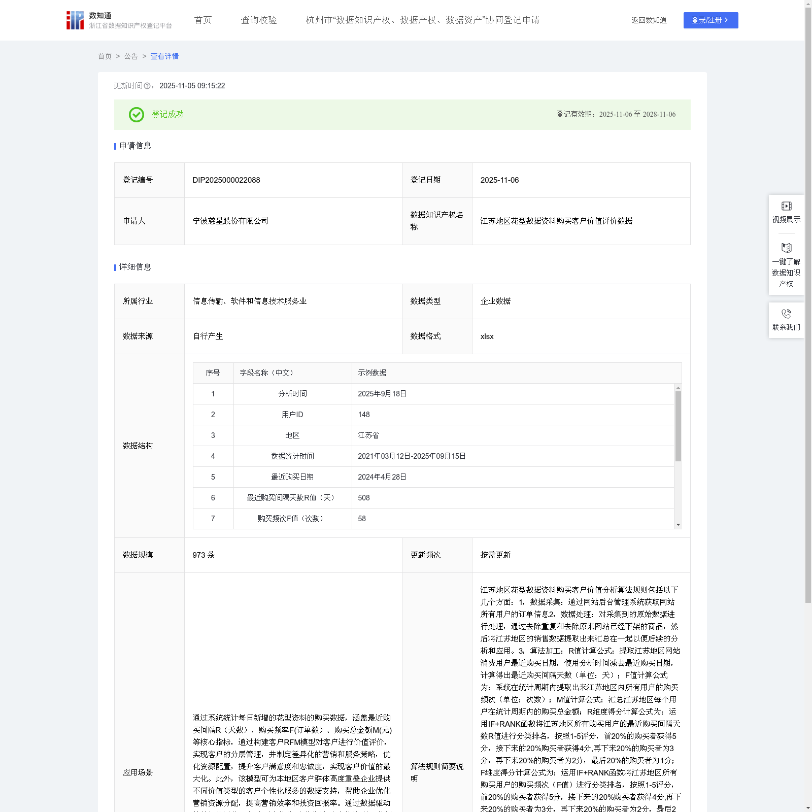 宁波慈星股份有限公司 本次登记的数据知识产权 江苏地区花型数据资料购买客户价值评价数据, 通过系统统计每日新增的花型资料的购买数据,涵盖最近购买间隔R(天数)、购买频率F(订单数)、购买总金额M(元)等核心指标,通过构建客户RFM模型对客户进行价值评价,实现客户的分层管理,并制定差异化的营销和服务策略,优化资源配置,提升客户满意度和忠诚度,实现客户价值的最大化。此外,该模型可为本地区客户群体高度重叠企业提供不同价值类型的客户个性化服务的数据支持,帮助企业优化营销资源分配,提高营销效率和投资回报率。通过数据驱动的精细化运营,实现“用户价值-企业收益-生态价值”的三维提升。 江苏地区花型数据资料购买客户价值分析算法规则包括以下几个方面:1,数据采集:通过网站后台管理系统获取网站所有用户的订单信息2,数据处理:对采集到的原始数据进行处理,通过去除重复和去除原来网站已经下架的商品,然后将江苏地区的销售数据提取出来汇总在一起以便后续的分析和应用。3,算法加工:R值计算公式:提取江苏地区网站消费用户最近购买日期,使用分析时间减去最近购买日期,计算得出最近购买间隔天数(单位:天);F值计算公式为:系统在统计周期内提取出来江苏地区内所有用户的购买频次(单位:次数);M值计算公式:汇总江苏地区每个用户在统计周期内的购买总金额;R维度得分计算公式为:运用IF+RANK函数将江苏地区所有购买用户的最近购买间隔天数R值进行分类排名,按照1-5评分,前20%的购买者获得5分,接下来的20%购买者获得4分,再下来20%的购买者为3分,再下来20%的购买者为2分,最后20%的购买者为1分;F维度得分计算公式为:运用IF+RANK函数将江苏地区所有购买用户的购买频次(F值)进行分类排名,按照1-5评分,前20%的购买者获得5分,接下来的20%购买者获得4分,再下来20%的购买者为3分,再下来20%的购买者为2分,最后20%的购买者为1分;M维度得分计算公式为:运用IF+RANK函数将江苏地区所有购买用户在统计周期内购买总金额(M值)进行分类排名,按照1-5评分,前20%的购买者获得5分,接下来的20%购买者获得4分,再下来20%的购买者为3分,再下来20%的购买者为2分,最后20%的购买者为1分。因此计算出来江苏地区每个用户的RFM总评分=a*R维度得分+b*F维度得分+c*M维度得分,其中a,b,c为权重系数分别为0.3,0.3,0.4; 然后对计算出来的RFM总评分参照平台拟定的评分标准进行评分得出客户等级(A/B/C/D)。评分标准详细:计算出来的评分大于等于4分的为A级购买者,大于等于3分小于4分的为B级购买者,大于等于2分小于3分的为C级购买者,低于2分的为D级购买者。