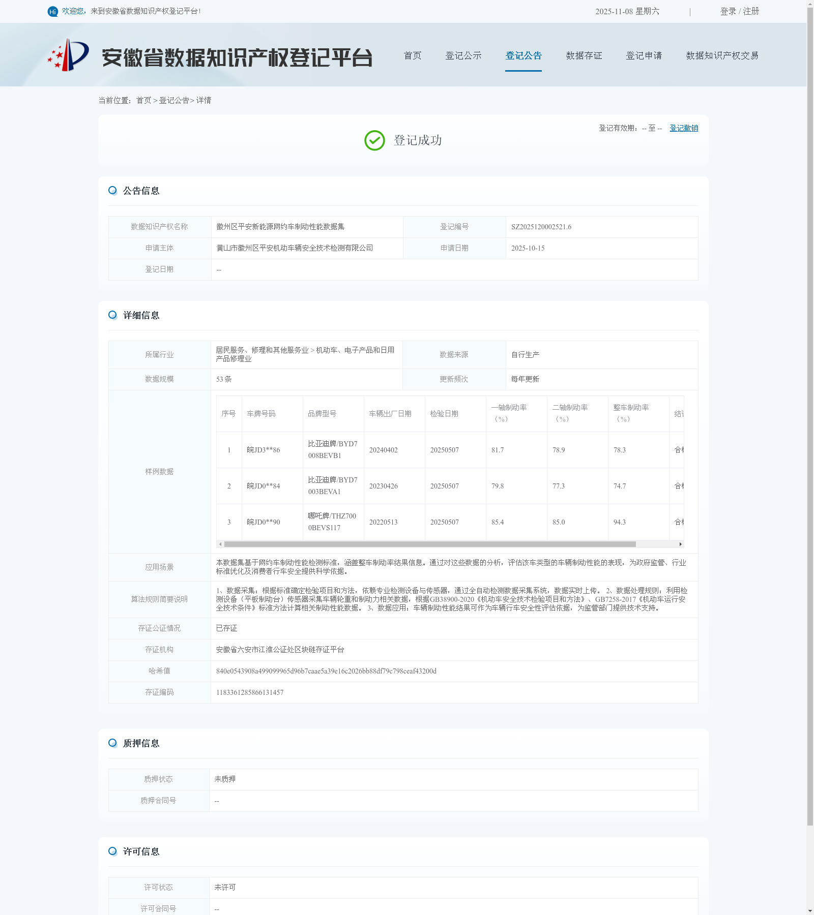 黄山市徽州区平安机动车辆安全技术检测有限公司 本次登记的数据知识产权 徽州区平安新能源网约车制动性能数据集, “徽州区平安新能源网约车制动性能数据集”系我公司自行生产,包括序号、车牌号码、品牌型号、车辆出厂日期、检验日期、一轴制动率(%)、 二轴制动率(%)、整车制动率(%)、结论等数据。来源合法,未涉及个人隐私、商业秘密及第三方纠纷。