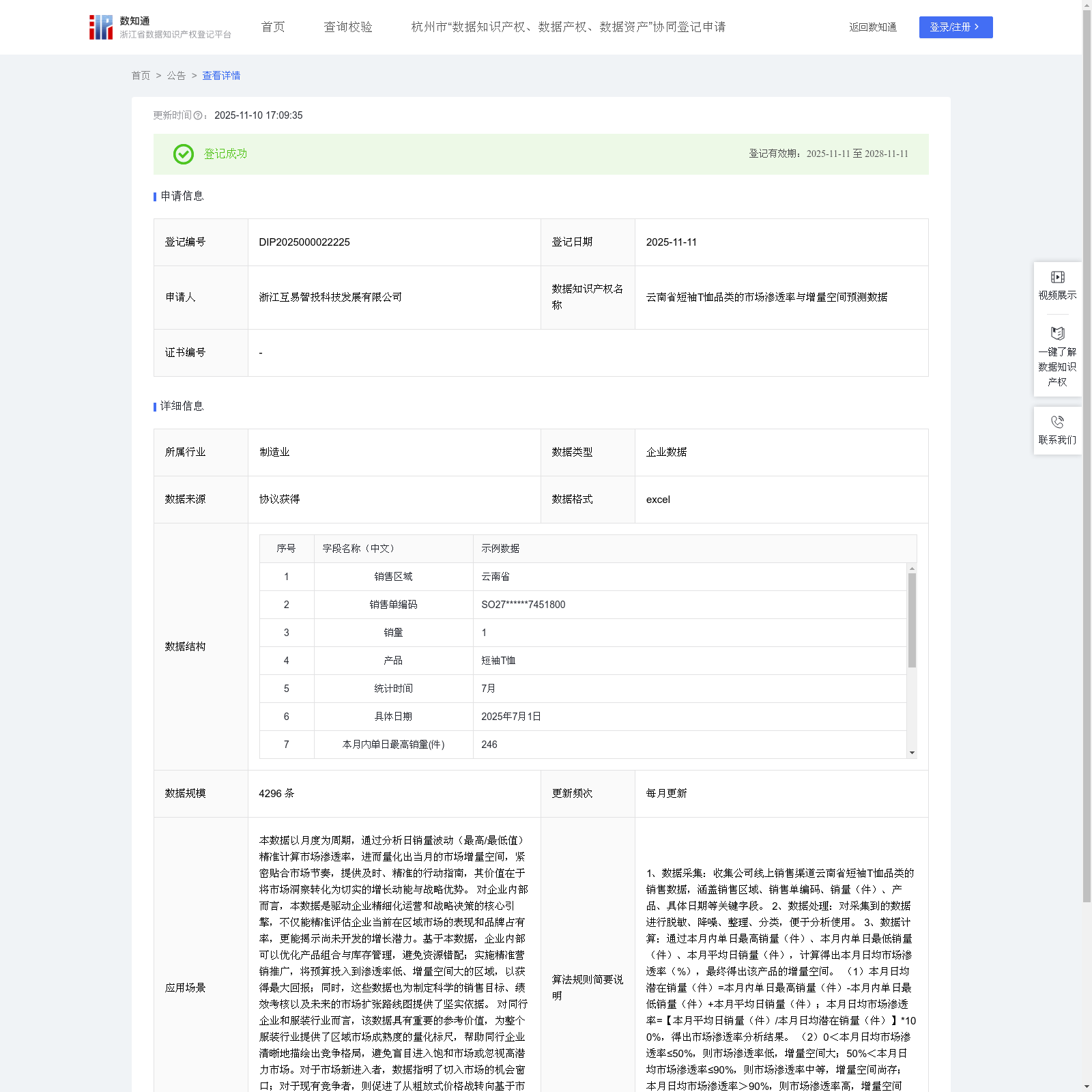 浙江互易智投科技发展有限公司 本次登记的数据知识产权 云南省短袖T恤品类的市场渗透率与增量空间预测数据, 本数据以月度为周期,通过分析日销量波动(最高/最低值)精准计算市场渗透率,进而量化出当月的市场增量空间,紧密贴合市场节奏,提供及时、精准的行动指南,其价值在于将市场洞察转化为切实的增长动能与战略优势。 对企业内部而言,本数据是驱动企业精细化运营和战略决策的核心引擎,不仅能精准评估企业当前在区域市场的表现和品牌占有率,更能揭示尚未开发的增长潜力。基于本数据,企业内部可以优化产品组合与库存管理,避免资源错配;实施精准营销推广,将预算投入到渗透率低、增量空间大的区域,以获得最大回报;同时,这些数据也为制定科学的销售目标、绩效考核以及未来的市场扩张路线图提供了坚实依据。 对同行企业和服装行业而言,该数据具有重要的参考价值,为整个服装行业提供了区域市场成熟度的量化标尺,帮助同行企业清晰地描绘出竞争格局,避免盲目进入饱和市场或忽视高潜力市场。对于市场新进入者,数据指明了切入市场的机会窗口;对于现有竞争者,则促进了从粗放式价格战转向基于市场分层的差异化竞争。同时,这些洞察也有助于上游供应商预测需求、下游渠道商优化选品,共同推动产业链的效率提升与协同发展。1、数据采集:收集公司线上销售渠道云南省短袖T恤品类的销售数据,涵盖销售区域、销售单编码、销量(件)、产品、具体日期等关键字段。 2、数据处理:对采集到的数据进行脱敏、降噪、整理、分类,便于分析使用。 3、数据计算:通过本月内单日最高销量(件)、本月内单日最低销量(件)、本月平均日销量(件),计算得出本月日均市场渗透率(%),最终得出该产品的增量空间。 (1)本月日均潜在销量(件)=本月内单日最高销量(件)-本月内单日最低销量(件)+本月平均日销量(件);本月日均市场渗透率=【本月平均日销量(件)/本月日均潜在销量(件)】*100%,得出市场渗透率分析结果。 (2)0<本月日均市场渗透率≤50%,则市场渗透率低,增量空间大;50%<本月日均市场渗透率≤90%,则市场渗透率中等,增量空间尚存;本月日均市场渗透率>90%,则市场渗透率高,增量空间小。