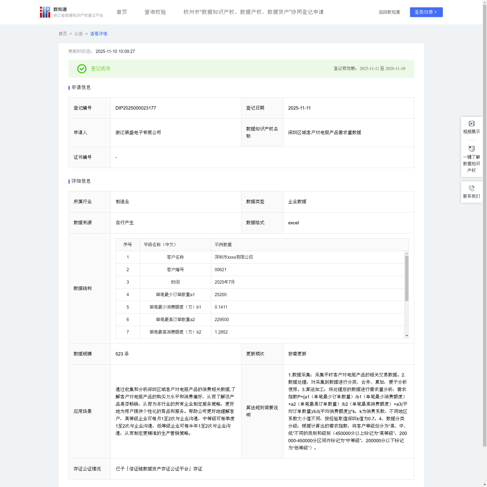 浙江骐盛电子有限公司 本次登记的数据知识产权 深圳区域客户对电阻产品需求量数据, 通过收集和分析深圳区域客户对电阻产品的消费相关数据,了解客户对电阻产品的购买力水平和消费偏好,从而了解该产品是否畅销,从而为本行业的所有企业制定服务策略,更好地为用户提供个性化的商品和服务。帮助公司更好地理解客户,高等级企业可每月1至2次与企业沟通,中等级可每季度1至2次与企业沟通,低等级企业可每半年1至2次与企业沟通,从而制定更精准的生产营销策略。1.数据采集:采集平时客户对电阻产品的相关交易数据。2.数据处理:对采集到数据进行分类、合并、累加,便于分析使用。3.算法加工:将处理后的数据进行需求量分析:需求指数P=a1(单笔最少订单数量)/b1(单笔最少消费额度)+a2(单笔最高订单数量)/b2(单笔最高消费额度)+a3(平均订单数量)/b3(平均消费额度)*k,k为消费系数,不同地区系数大小值不同,按经验取值深圳k值为0.7。4、数据分类分级:根据计算出的需求指数,将客户等级划分为“高、中、低”不同的类别和级别(450000分以上标记为“高等级”,200000-450000分区间内标记为“中等级”,200000分以下标记为“低等级”)。