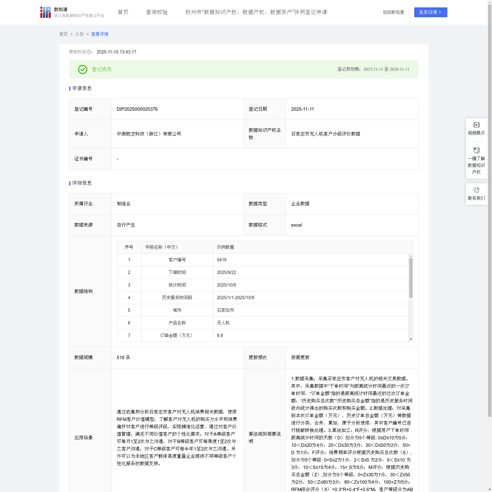 2025-11-10 , 中测航空科技(浙江)有限公司 旗下 石家庄市无人机客户分级评价数据 数据知识产权在 浙江省数据知识产权登记平台 完成登记 , 应用于 客户关系管理、消费行为分析 领域