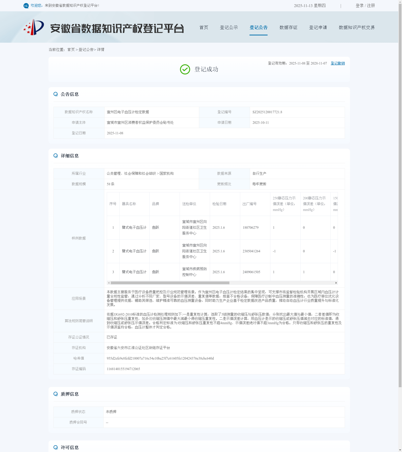 宣城市宣州区消费者权益保护委员会秘书处 本次登记的数据知识产权 宣州区电子血压计检定数据, 数据是宣城市检验所依据《JJG 692-2010 无创自动测量血压计》标准,对送检单位的血压计五个点进行降压检定,若收缩压和舒张压重复性不超4mmHg、示值误差绝对值不超3mmHg为合格,并生成检定证书。本单位对检定证书进行整理汇总,并制定表格填写品牌、送检单位、检验日期、出厂编号、静态压力示值误差、收缩压及舒张压重复值、证书编号等信息,数据由此而来。