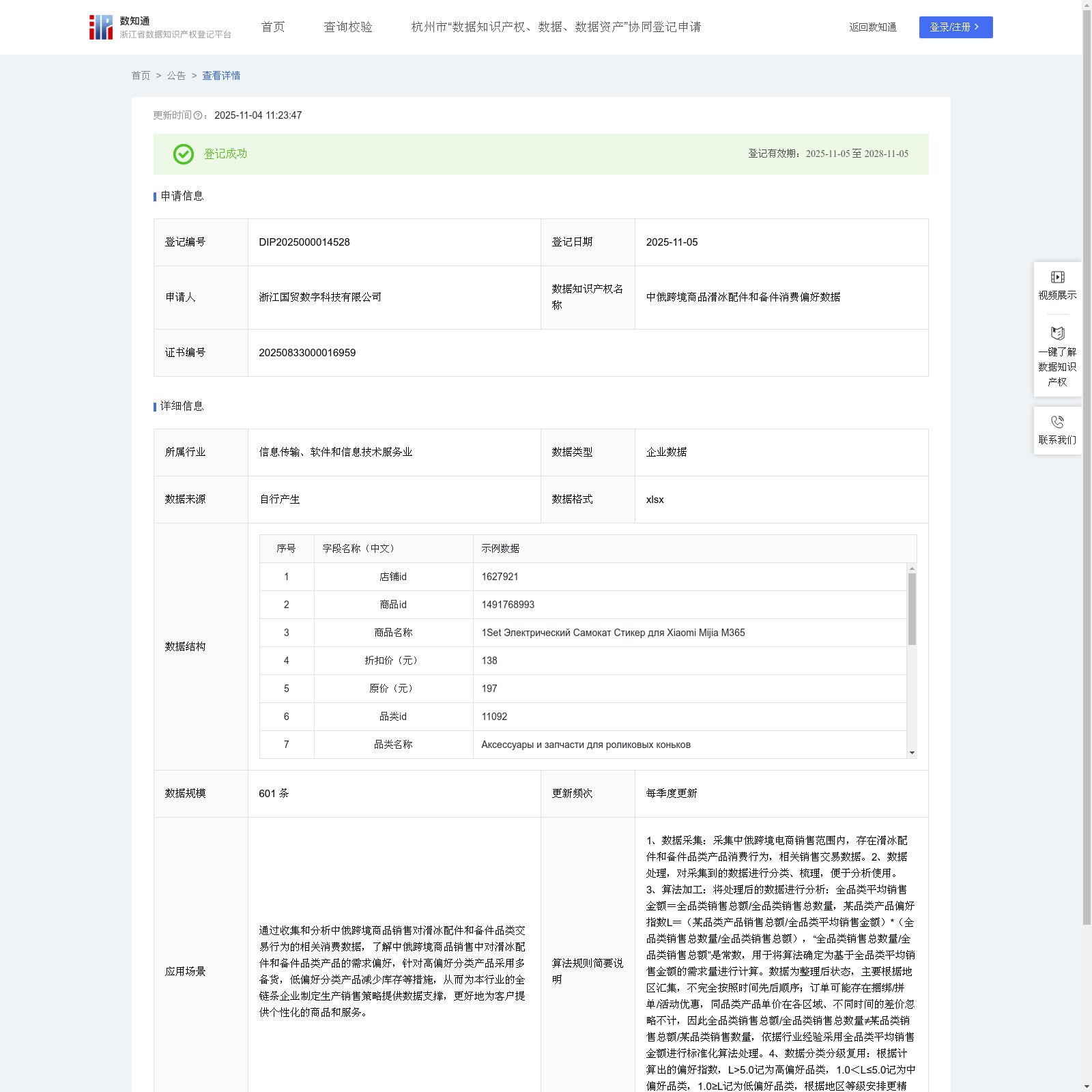 浙江国贸数字科技有限公司 本次登记的数据知识产权 中俄跨境商品滑冰配件和备件消费偏好数据, 通过收集和分析中俄跨境商品销售对滑冰配件和备件品类交易行为的相关消费数据,了解中俄跨境商品销售中对滑冰配件和备件品类产品的需求偏好,针对高偏好分类产品采用多备货,低偏好分类产品减少库存等措施,从而为本行业的全链条企业制定生产销售策略提供数据支撑,更好地为客户提供个性化的商品和服务。1、数据采集:采集中俄跨境电商销售范围内,存在滑冰配件和备件品类产品消费行为,相关销售交易数据。2、数据处理,对采集到的数据进行分类、梳理,便于分析使用。3、算法加工:将处理后的数据进行分析:全品类平均销售金额=全品类销售总额/全品类销售总数量,某品类产品偏好指数L=(某品类产品销售总额/全品类平均销售金额)*(全品类销售总数量/全品类销售总额),“全品类销售总数量/全品类销售总额”是常数,用于将算法确定为基于全品类平均销售金额的需求量进行计算。数据为整理后状态,主要根据地区汇集,不完全按照时间先后顺序;订单可能存在捆绑/拼单/活动优惠,同品类产品单价在各区域、不同时间的差价忽略不计,因此全品类销售总额/全品类销售总数量≠某品类销售总额/某品类销售数量,依据行业经验采用全品类平均销售金额进行标准化算法处理。4、数据分类分级复用:根据计算出的偏好指数,L>5.0记为高偏好品类,1.0<L≤5.0记为中偏好品类,1.0≥L记为低偏好品类,根据地区等级安排更精准的生产营销策略,例如:加大高偏好品类的铺货量等。