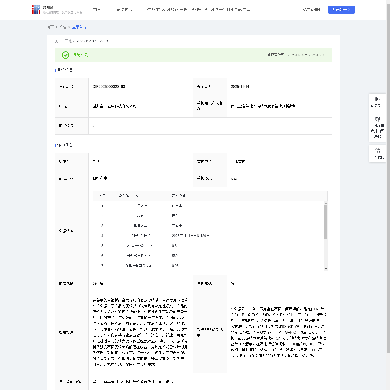 温州宝丰包装科技有限公司 本次登记的数据知识产权 西点盒在各地的促销力度效益比分析数据, 在各地的促销折扣会大幅影响西点盒销量,促销力度与效益比的数据对于产品的促销折扣决策具有决定性意义。产品的促销力度效益比数据分析能让企业更好优化下阶段的经营计划,针对产品制定更好的网红营销推广方案,不同的区域、时间节点,采取适当的促销力度,在适当让利各客户的情况下,既提高产品销量,又保证客户低成本购买产品。该项数据分析可以向包装行业从业者进行广泛推广,行业内商家均可通过适当的促销力度来保证经营效益。同时,本数据还能辅助预测不同促销策略的潜在收益,为制定长期营销计划提供依据。对销售平台而言,这一分析可优化促销资源分配;对消费者而言,合理的促销策略能提升购买意愿;对供应商而言,则能更好地匹配库存与市场需求。1.数据采集:采集西点盒在不同时间周期的产品定价Q、计划销量P、促销折扣额D、折扣后价格H、实际销量I,按照周期进行整理归纳。 2.数据运算:对采集得到的数据按照如下公式进行计算:促销力度效益比IQ=(G*I)/P,得到促销力度效益比系数,其中G表示折扣率,G=H/Q。 3.数据分析:根据产品的促销力度效益比数IQ可分析促销力度对产品销售效益带来的影响。在不进行任何促销时,IQ值为1;IQ大于1,说明在当前周期内促销力度的折扣取得的效益高;IQ小于1,说明在当前周期内促销力度的折扣取得的效益低。