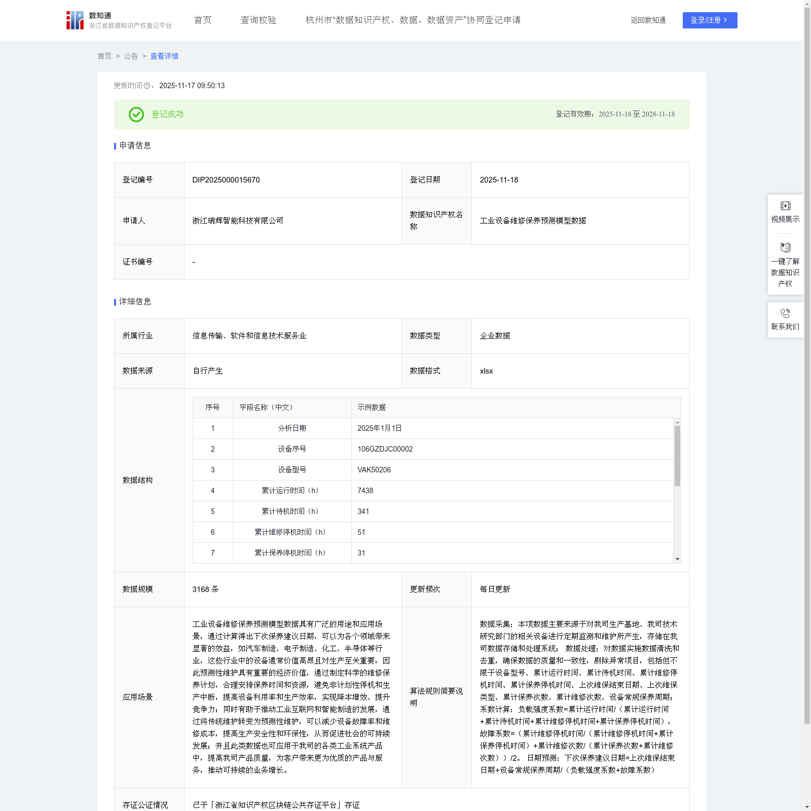 浙江瑞辉智能科技有限公司 本次登记的数据知识产权 工业设备维修保养预测模型数据, 工业设备维修保养预测模型数据具有广泛的用途和应用场景,通过计算得出下次保养建议日期,可以为各个领域带来显著的效益,如汽车制造、电子制造、化工、半导体等行业,这些行业中的设备通常价值高昂且对生产至关重要,因此预测性维护具有重要的经济价值,通过制定科学的维修保养计划,合理安排保养时间和资源,避免非计划性停机和生产中断,提高设备利用率和生产效率,实现降本增效、提升竞争力;同时有助于推动工业互联网和智能制造的发展,通过将传统维护转变为预测性维护,可以减少设备故障率和维修成本,提高生产安全性和环保性,从而促进社会的可持续发展;并且此类数据也可应用于我司的各类工业系统产品中,提高我司产品质量,为客户带来更为优质的产品与服务,推动可持续的业务增长。 数据采集:本项数据主要来源于对我司生产基地、我司技术研究部门的相关设备进行定期监测和维护所产生,存储在我司数据存储和处理系统; 数据处理:对数据实施数据清洗和去重,确保数据的质量和一致性,剔除异常项目,包括但不限于设备型号、累计运行时间、累计待机时间、累计维修停机时间、累计保养停机时间、上次维保结束日期、上次维保类型、累计保养次数、累计维修次数、设备常规保养周期; 系数计算:负载强度系数=累计运行时间/(累计运行时间+累计待机时间+累计维修停机时间+累计保养停机时间),故障系数=(累计维修停机时间/(累计维修停机时间+累计保养停机时间)+累计维修次数/(累计保养次数+累计维修次数))/2。 日期预测:下次保养建议日期=上次维保结束日期+设备常规保养周期/(负载强度系数+故障系数)