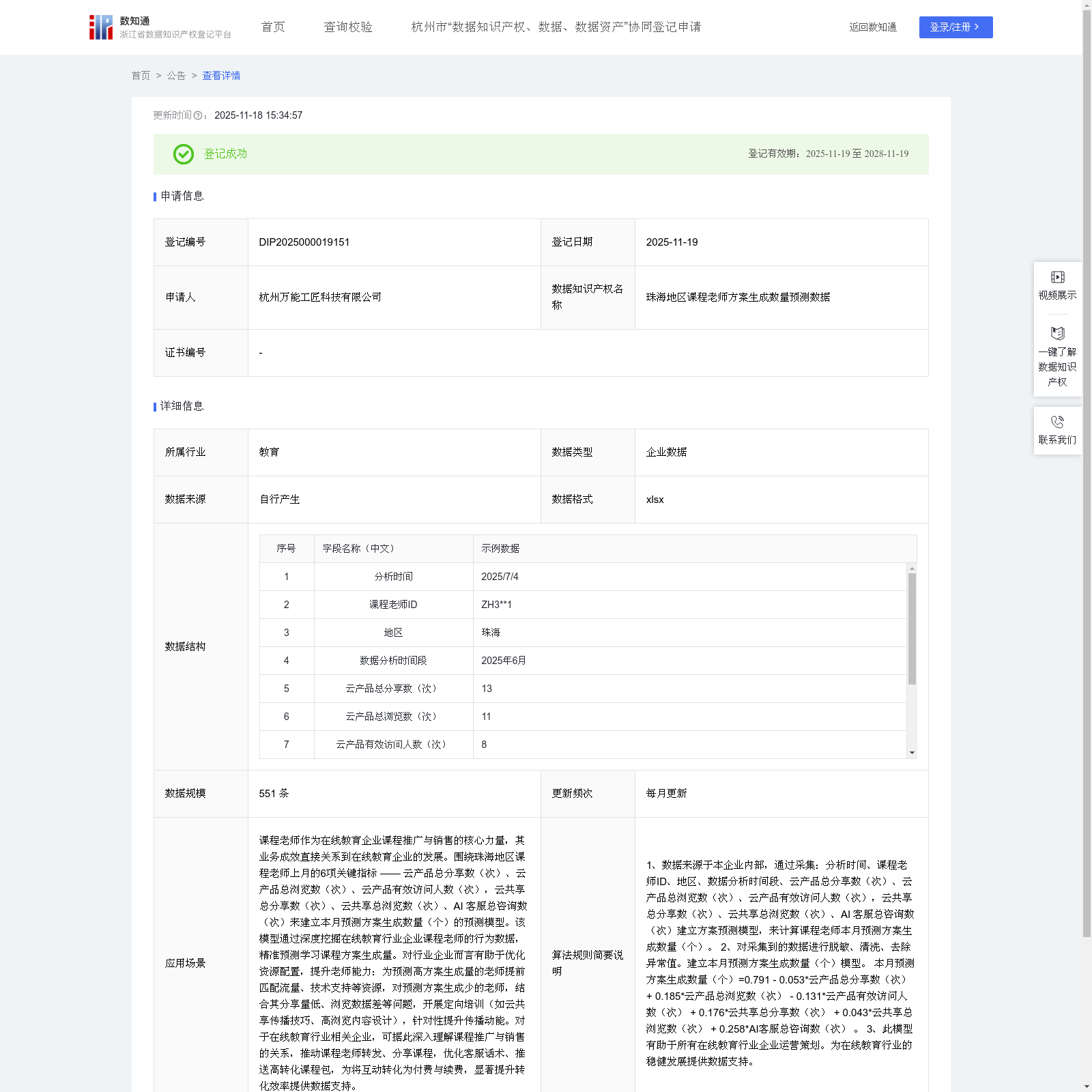 杭州万能工匠科技有限公司 本次登记的数据知识产权 珠海地区课程老师方案生成数量预测数据, 课程老师作为在线教育企业课程推广与销售的核心力量,其业务成效直接关系到在线教育企业的发展。围绕珠海地区课程老师上月的6项关键指标 —— 云产品总分享数(次)、云产品总浏览数(次)、云产品有效访问人数(次),云共享总分享数(次)、云共享总浏览数(次)、AI 客服总咨询数(次)来建立本月预测方案生成数量(个)的预测模型。该模型通过深度挖掘在线教育行业企业课程老师的行为数据,精准预测学习课程方案生成量。对行业企业而言有助于优化资源配置,提升老师能力:为预测高方案生成量的老师提前匹配流量、技术支持等资源,对预测方案生成少的老师,结合其分享量低、浏览数据差等问题,开展定向培训(如云共享传播技巧、高浏览内容设计),针对性提升传播动能。对于在线教育行业相关企业,可据此深入理解课程推广与销售的关系,推动课程老师转发、分享课程,优化客服话术、推送高转化课程包,为将互动转化为付费与续费,显著提升转化效率提供数据支持。1、数据来源于本企业内部,通过采集:分析时间、课程老师ID、地区、数据分析时间段、云产品总分享数(次)、云产品总浏览数(次)、云产品有效访问人数(次),云共享总分享数(次)、云共享总浏览数(次)、AI 客服总咨询数(次)建立方案预测模型,来计算课程老师本月预测方案生成数量(个)。 2、对采集到的数据进行脱敏、清洗、去除异常值。建立本月预测方案生成数量(个)模型。 本月预测方案生成数量(个)=0.791 - 0.053*云产品总分享数(次) + 0.185*云产品总浏览数(次) - 0.131*云产品有效访问人数(次) + 0.176*云共享总分享数(次) + 0.043*云共享总浏览数(次) + 0.258*AI客服总咨询数(次) 。 3、此模型有助于所有在线教育行业企业运营策划。为在线教育行业的稳健发展提供数据支持。