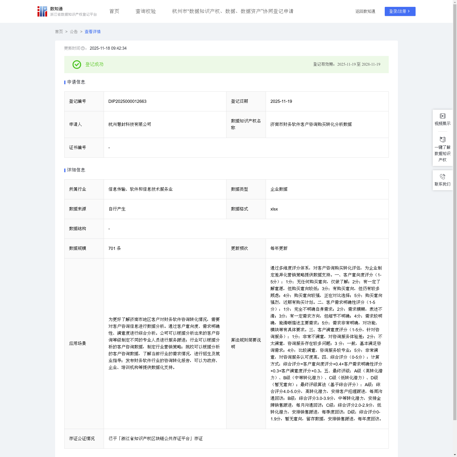 杭州慧封科技有限公司 本次登记的数据知识产权 济南市财务软件客户咨询购买转化分析数据, 为更好了解济南市地区客户对财务软件咨询转化情况,需要对客户咨询信息进行数据分析。通过客户意向度、需求明确性、满意度进行综合分析。公司可以根据分析出来的客户咨询等级制定不同的专业人员进行服务跟进;行业可以根据分析的客户咨询数据,制定行业营销策略;院校可以根据分析的客户咨询数据,了解当前行业的需求情况,进行招生及就业指导;发布财务软件行业的咨询转化报告,可以为政府、企业、培训机构等提供数据化支持。通过多维度评分体系,对客户咨询购买转化评估,为企业制定差异化营销策略提供数据支持。一、客户意向度评分(1-5分):1分:无任何购买意向,仅做了解;2分:有一定了解意愿,但购买意向较低;3分:有购买意向,但仍有较多顾虑;4分:购买意向较强,正在对比选择;5分:购买意向强烈,近期有购买计划。二、客户需求明确性评分(1-5分):1分:完全不明确自身需求;2分:需求模糊,表述不清;3分:有一定需求方向,但细节不明确;4分:需求较明确,能清晰描述主要需求;5分:需求非常明确,对功能、模块等有具体要求。三、客户满意度评分(1-5分,针对咨询服务):1分:非常不满意,对咨询服务体验差;2分:不太满意,咨询服务存在较多问题;3 分:一般,基本满足咨询需求;4分:比较满意,咨询服务较专业;5分:非常满意,对咨询服务认可度高。四、综合评分(0-5分):计算方式:综合评分=客户意向度评分×0.4+客户需求明确性评分×0.3+客户满意度评分×0.3。五、最终评级:A级(高转化潜力)、B级(中等转化潜力)、C级(低转化潜力)、D级(暂无意向);最终评级算法(基于综合评分):A级:综合评分4.0-5.0分,高转化潜力,安排客户经理跟进,每周沟通回访;B级:综合评分3.0-3.9分,中等转化潜力,安排金牌销售跟进,每月沟通回访;C级:综合评分2.0-2.9分,低转化潜力,安排销售跟进,每季度回访;D级:综合评分0-1.9分,暂无意向,留存数据,安排销售跟进,每年度回访。