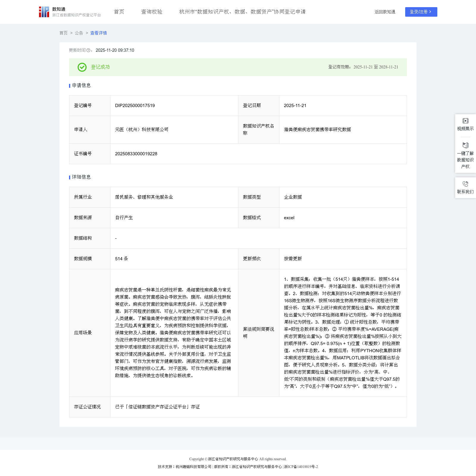 元医(杭州)科技有限公司 本次登记的数据知识产权 猫粪便痢疾志贺菌携带率研究数据, 痢疾志贺菌是一种革兰氏阴性杆菌,是细菌性痢疾最为常见病原菌。痢疾志贺菌感染会导致发热,腹泻,结肠炎性肿胀等症状。痢疾志贺菌的宠物临床表现多样,从无症状携带菌,到不同程度的腹泻,可在人与宠物之间广泛传播,影响人类健康。了解猫粪便中痢疾志贺菌的携带率对于评估公共卫生风险具有重要意义,为疾病预防和控制提供科学依据,保障宠物及人类健康。猫粪便痢疾志贺菌携带率研究还可以为流行病学的研究提供数据支持,有助于确定中国本土区域宠物中艰难梭菌的本底流行水平,为判断后续可能出现的异常流行情况提供基线参照。关于外部复用价值,对于卫生监管部门,可作为发布官方健康指数,溯源流行病发展,监测环境疾病预防的核心工具,对于医院,可作为疾病诊断的辅助措施,为提供微生态视角的诊断线索。1、数据采集:收集一批(514只)猫粪便样本,按照1-514的顺序进行样本编号,并对基础信息、临床资料进行分析调查。2、数据检测:对收集到的514只动物粪便样本分别进行16S微生物测序,按照16S微生物测序数据分析流程进行数据分析,在属水平上统计痢疾志贺菌检出量%,痢疾志贺菌检出量%大于0的样本检测结果标记为阳性,等于0 的检测结果标记为阴性。3、数据处理:① 统计阳性总数,平均携带率=阳性总数/样本总数;② 平均携带丰度%=AVERAGE(痢疾志贺菌检出量%);③ 将痢疾志贺菌检出量%按照从小到大的顺序排序,Q97.5= 0.975(n + 1)位置(取整数)的检测数值,n为样本总数。4、数据应用:利用PYTHON收集群体样本痢疾志贺菌检出量%,用MATPLOTLIB将该数据画出拟合图,便于研究人员观察分析。5、数据分类分级:将计算出的痢疾志贺菌菌检出量%进行指标评价,分为“高、中、低“不同的类别和级别(痢疾志贺菌检出量%值大于Q97.5的为“高”,大于0且小于等于Q97.5为“中”,值为0的为“低”)。