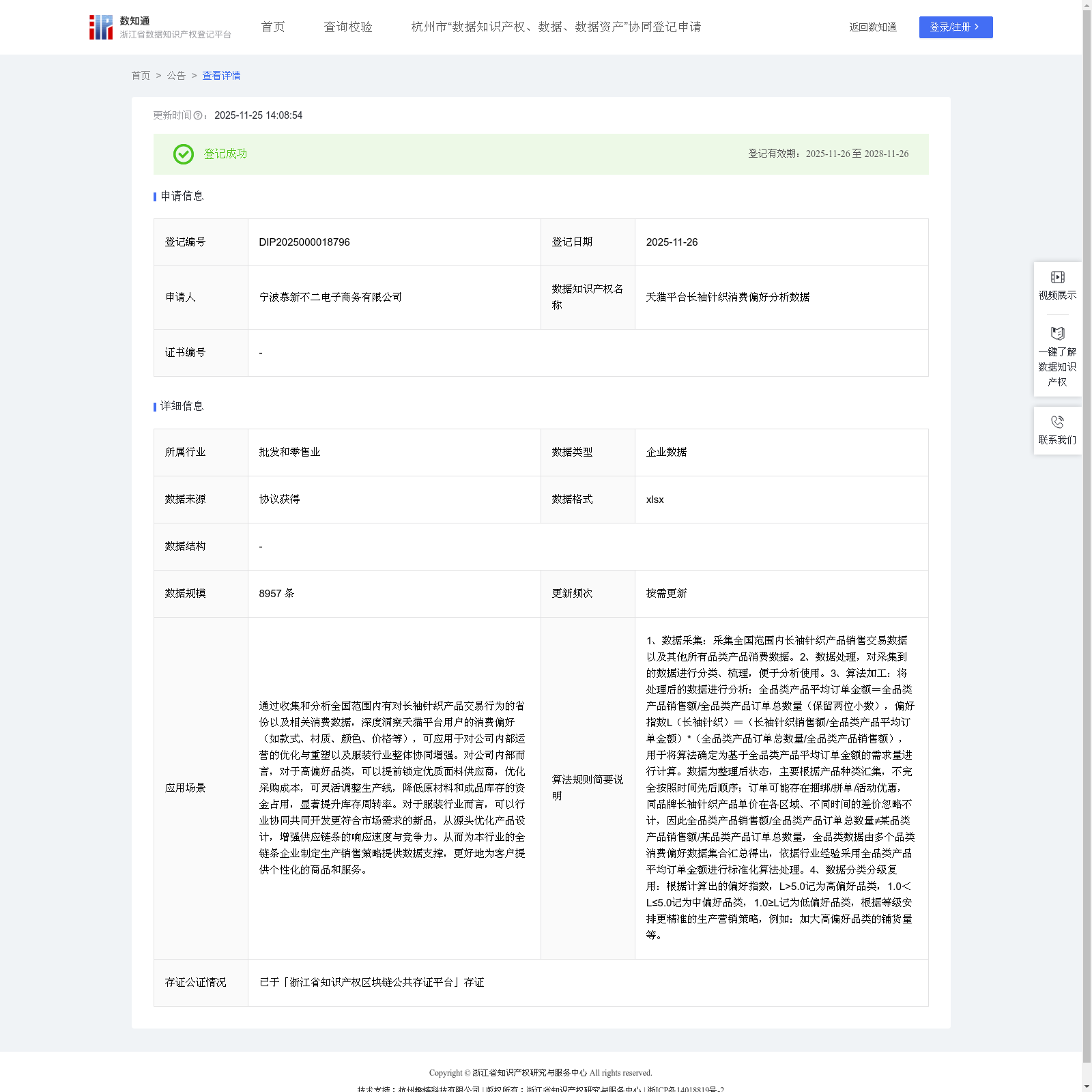 关于 浙江省数据知识产权登记平台 , 浙江省数据知识产权登记平台是一个专门用于登记和管理数据知识产权的官方平台。该平台允许企业和个人申请登记其数据知识产权,包括专利分类数据、客户价值评估数据等。平台提供公告功能,展示已登记、放弃或撤销的数据知识产权信息,并提供详细的申请人、申请时间和更新信息。