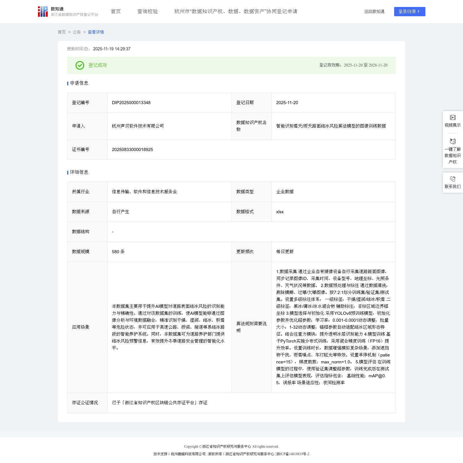 杭州声贝软件技术有限公司 本次登记的数据知识产权 智能识别雪天/雨天路面结冰风险算法模型的图像训练数据, 本数据集主要用于提升AI模型对道路表面结冰风险的识别能力与精确性。通过对该数据集的训练,使AI模型能够通过图像分析与环境数据融合,精准识别干燥、湿润、结冰、积雪等危险状态,并可应用于高速公路、桥梁、隧道等易结冰路段的智能养护系统。同时,本数据集可为道路养护部门提供结冰风险预警信息,有效提升冬季道路安全管理的智能化水平。 1.数据采集 通过企业自有摄像设备自行采集道路路面图像,同步记录图像ID、采集时间、设备型号、地理坐标、光照条件、天气状况等数据。 2.数据预处理与标注 通过数据清洗,剔除模糊、过曝/欠曝图像。按7:2:1划分训练集/验证集/测试集。设置多级标注体系: 一级标签:干燥/湿润/结冰/积雪 二级标签:黑冰/薄冰/冰水混合物 辅助标注:目标区域边界框坐标 3.模型选择与初始化 采用YOLOv8预训练模型,初始化参数并优化超参数:学习率:0.001-0.0001动态调整,批量大小:1-32动态调整,锚框参数自动适配结冰区域形态特征。结合注意力模块:提升透明冰层识别能力 4.模型训练 基于PyTorch实施分布式训练,采用混合精度训练(FP16)提升效率。设置训练时长,数据增强模拟复杂场景,添加遮挡物干扰、雨雪噪点、车灯眩光等特效。设置早停机制(patience=15),梯度裁剪:max_norm=1.0。 5.模型评估 在训练模型的过程中,使用验证集调整超参数,训练完成后在测试集上评估模型表现,评估指标包含: 基础性能:mAP@0.5、误报率 场景适应性:夜间检测率