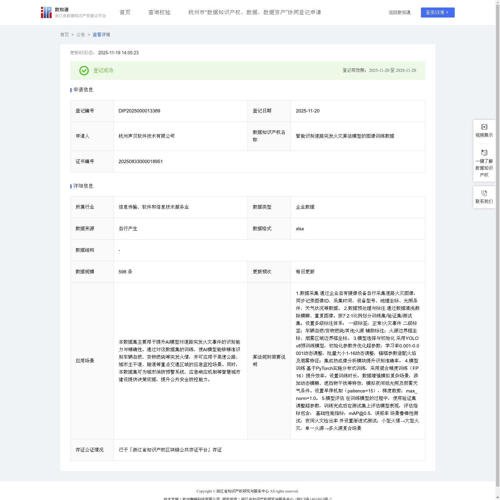 杭州声贝软件技术有限公司 本次登记的数据知识产权 智能识别道路突发火灾算法模型的图像训练数据, 本数据集主要用于提升AI模型对道路突发火灾事件的识别能力与精确性。通过对该数据集的训练,使AI模型能够精准识别车辆自燃、货物燃烧等突发火情,并可应用于高速公路、城市主干道、隧道等重点交通区域的应急监控场景。同时,本数据集可为城市消防预警系统、应急响应机制等智慧城市建设提供决策依据,提升公共安全防控能力。 1.数据采集 通过企业自有摄像设备自行采集道路火灾图像,同步记录图像ID、采集时间、设备型号、地理坐标、光照条件、天气状况等数据。 2.数据预处理与标注 通过数据清洗剔除模糊、重复图像。按7:2:1比例划分训练集/验证集/测试集。设置多级标注体系: 一级标签:正常/火灾事件 二级标签:车辆自燃/货物燃烧/其他火源 辅助标注:火源边界框坐标、烟雾区域边界框坐标。 3.模型选择与初始化 采用YOLOv8预训练模型,初始化参数并优化超参数:学习率0.001-0.0001动态调整,批量大小1-16动态调整,锚框参数适配火焰及烟雾特征;集成热成像分析模块提升识别准确率。 4.模型训练 基于PyTorch实施分布式训练,采用混合精度训练(FP16)提升效率。设置训练时长,数据增强模拟复杂场景,添加动态模糊、遮挡物干扰等特效,模拟夜间低光照及雨雾天气条件。设置早停机制(patience=15),梯度裁剪:max_norm=1.0。 5.模型评估 在训练模型的过程中,使用验证集调整超参数,训练完成后在测试集上评估模型表现,评估指标包含: 基础性能指标:mAP@0.5、误报率 场景鲁棒性测试:夜间火灾检出率 并设置渐进式测试:小型火情→大型火灾,单一火源→多火源复合场景