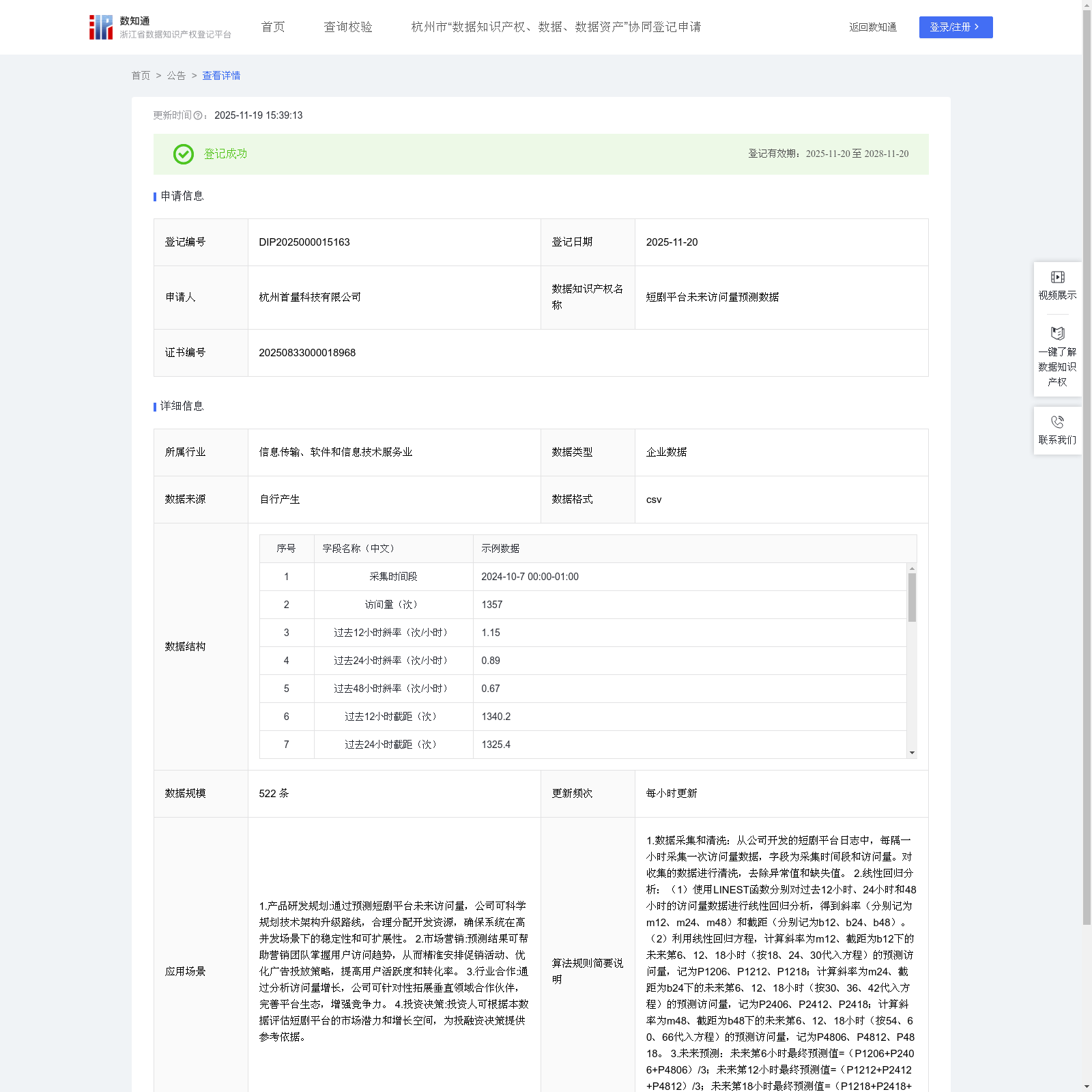 杭州首量科技有限公司 本次登记的数据知识产权 短剧平台未来访问量预测数据, 1.产品研发规划:通过预测短剧平台未来访问量,公司可科学规划技术架构升级路线,合理分配开发资源,确保系统在高并发场景下的稳定性和可扩展性。 2.市场营销:预测结果可帮助营销团队掌握用户访问趋势,从而精准安排促销活动、优化广告投放策略,提高用户活跃度和转化率。 3.行业合作:通过分析访问量增长,公司可针对性拓展垂直领域合作伙伴,完善平台生态,增强竞争力。 4.投资决策:投资人可根据本数据评估短剧平台的市场潜力和增长空间,为投融资决策提供参考依据。1.数据采集和清洗:从公司开发的短剧平台日志中,每隔一小时采集一次访问量数据,字段为采集时间段和访问量。对收集的数据进行清洗,去除异常值和缺失值。 2.线性回归分析:(1)使用LINEST函数分别对过去12小时、24小时和48小时的访问量数据进行线性回归分析,得到斜率(分别记为m12、m24、m48)和截距(分别记为b12、b24、b48)。(2)利用线性回归方程,计算斜率为m12、截距为b12下的未来第6、12、18小时(按18、24、30代入方程)的预测访问量,记为P1206、P1212、P1218;计算斜率为m24、截距为b24下的未来第6、12、18小时(按30、36、42代入方程)的预测访问量,记为P2406、P2412、P2418;计算斜率为m48、截距为b48下的未来第6、12、18小时(按54、60、66代入方程)的预测访问量,记为P4806、P4812、P4818。 3.未来预测:未来第6小时最终预测值=(P1206+P2406+P4806)/3;未来第12小时最终预测值=(P1212+P2412+P4812)/3;未来第18小时最终预测值=(P1218+P2418+P4818)/3。