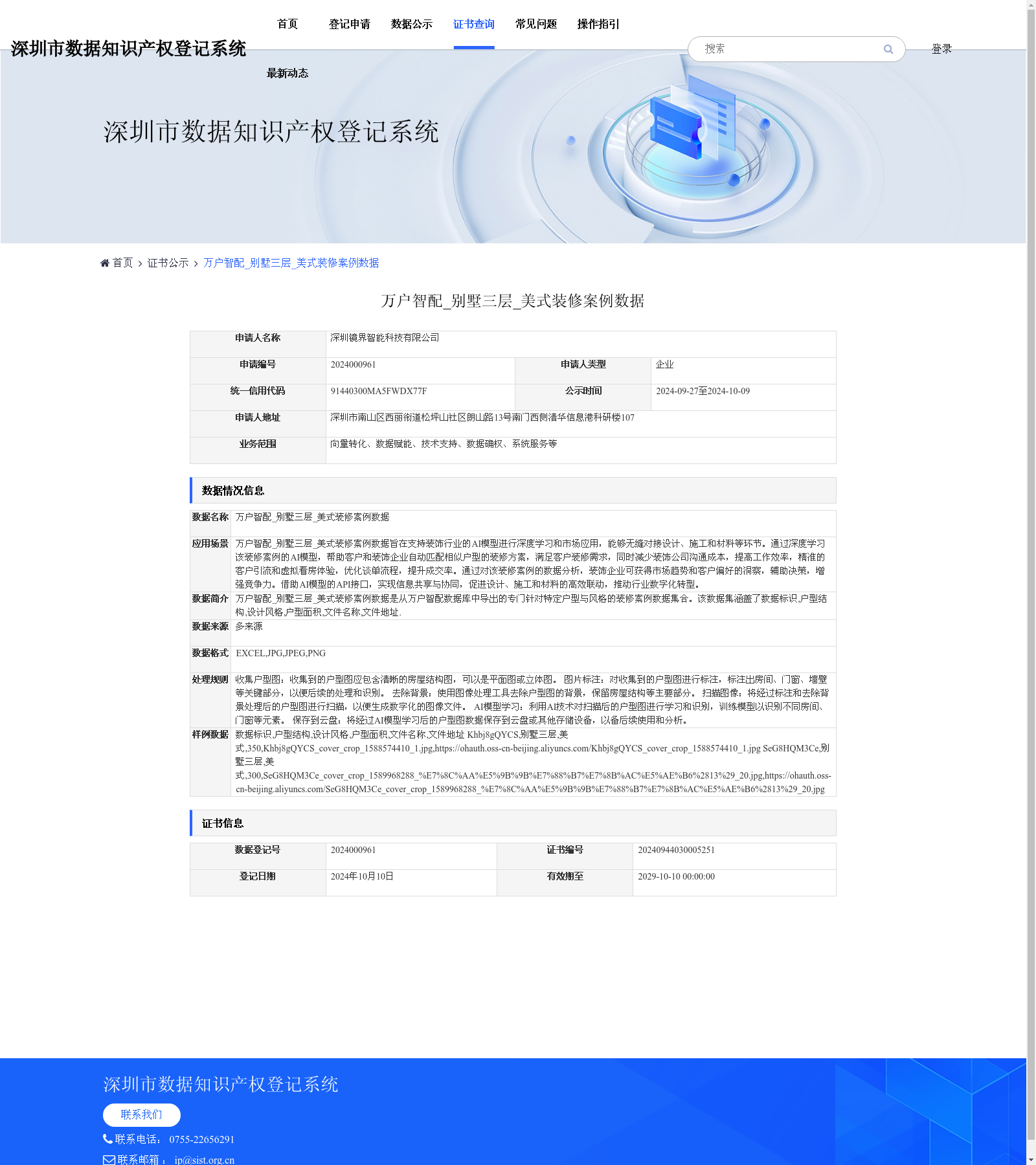 深圳镜界智能科技有限公司 本次登记的数据知识产权 万户智配_别墅三层_美式装修案例数据, 万户智配_别墅三层_美式装修案例数据旨在支持装饰行业的AI模型进行深度学习和市场应用,能够无缝对接设计、施工和材料等环节。通过深度学习该装修案例的AI模型,帮助客户和装饰企业自动匹配相似户型的装修方案,满足客户装修需求,同时减少装饰公司沟通成本,提高工作效率,精准的客户引流和虚拟看房体验,优化谈单流程,提升成交率。通过对该装修案例的数据分析,装饰企业可获得市场趋势和客户偏好的洞察,辅助决策,增强竞争力。借助AI模型的API接口,实现信息共享与协同,促进设计、施工和材料的高效联动,推动行业数字化转型。