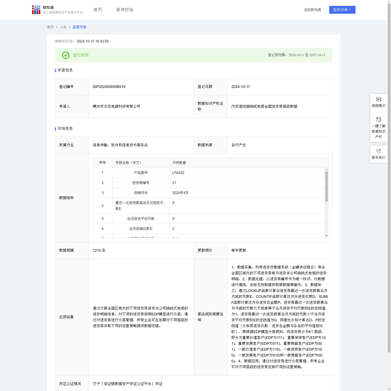 嵊州市兰花电器科技有限公司 本次登记的数据知识产权 汽车遥控器绕线电感全国进货商层级数据, 通过计算全国区域内的不同进货商进货本公司绕线式电感的进货明细信息,对不同的进货商按照EDP模型进行分层,通过对进货商进行分层管理,所有企业可在后期对不同层级的进货商采取不同的运营策略提供数据依据。1、数据采集:利用进货存管理系统(金蝶供应链云)导出全国区域内的不同进货商每月进货本公司绕线式电感的进货明细。2、数据处理:以进货商编号作为唯一标识,对数据进行清洗、去除无效数据和极限数据等操作。3、数据加工:通过LOOKUP函数计算出进货商最近一次进货距离当月月底的天数E,COUNTIF函数计算该月份进货次数D,SUMIF函数计算该月份进货总金额P,进货商最近一次进货距离当月月底的天数大于或者等于当月进货平均天数则E的定档值为1,进货商最近一次进货距离当月月底的天数小于当月进货平均天数则E的定档值为0,同理也分别计算出D、P的定档值(分别用进货次数、进货总金额与各自的平均值相比较),再根据EDP模型分层规则,将进货商分为8个层级,即分为重要价值客户(EDP为111)、重要保持客户(EDP为101)、重要发展客户(EDP为011)、重要挽留客户(EDP为001)、一般价值客户(EDP为110)、一般保持客户(EDP为100)、一般发展客户(EDP为010)和一般挽留客户(EDP为000)。4、数据应用:通过对进货商进行分层管理,所有企业可对不同层级的进货商定制不同的运营策略。