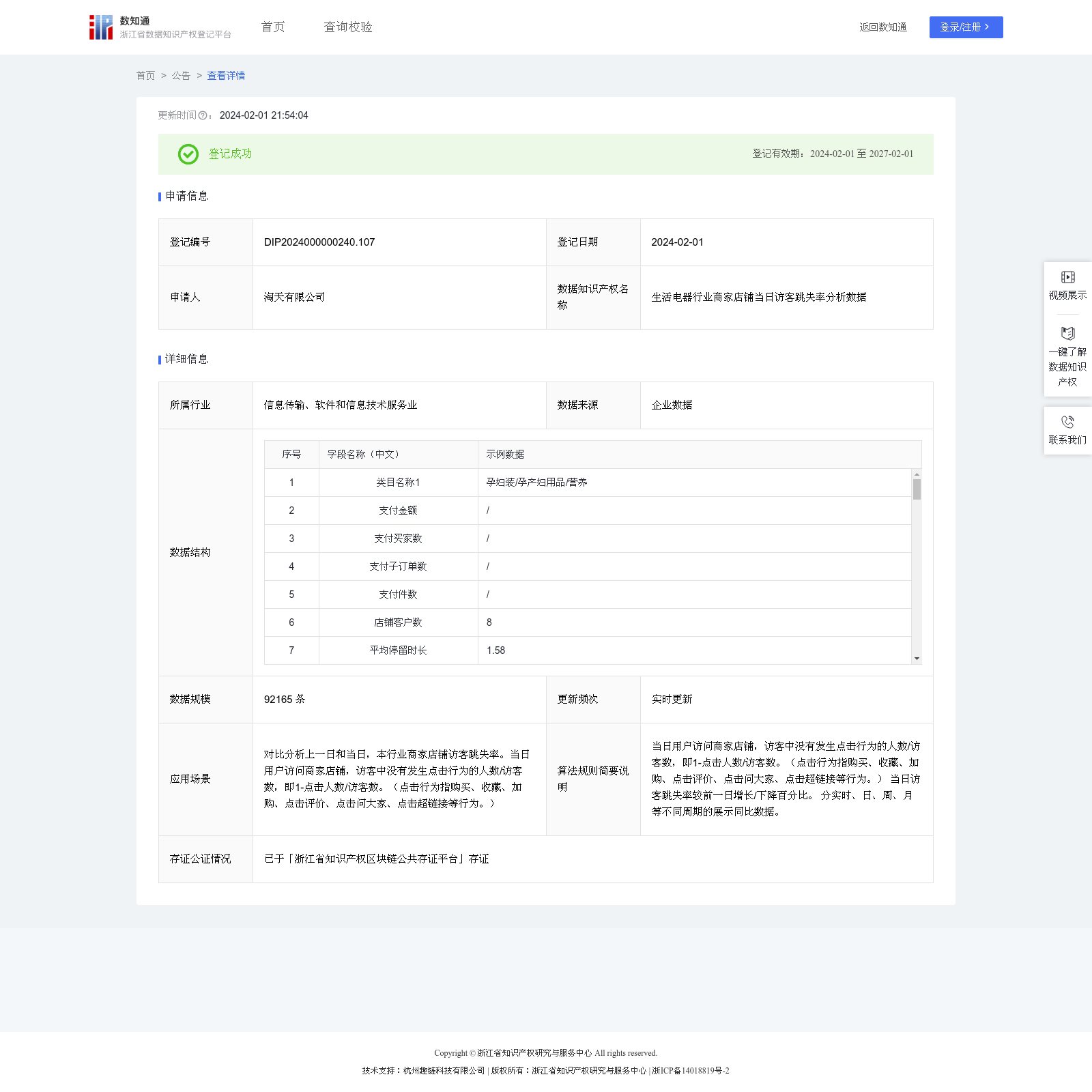 淘天有限公司 本次登记的数据知识产权 生活电器行业商家店铺当日访客跳失率分析数据, 对比分析上一日和当日,本行业商家店铺访客跳失率。当日用户访问商家店铺,访客中没有发生点击行为的人数/访客数,即1-点击人数/访客数。(点击行为指购买、收藏、加购、点击评价、点击问大家、点击超链接等行为。)当日用户访问商家店铺,访客中没有发生点击行为的人数/访客数,即1-点击人数/访客数。(点击行为指购买、收藏、加购、点击评价、点击问大家、点击超链接等行为。) 当日访客跳失率较前一日增长/下降百分比。 分实时、日、周、月等不同周期的展示同比数据。
