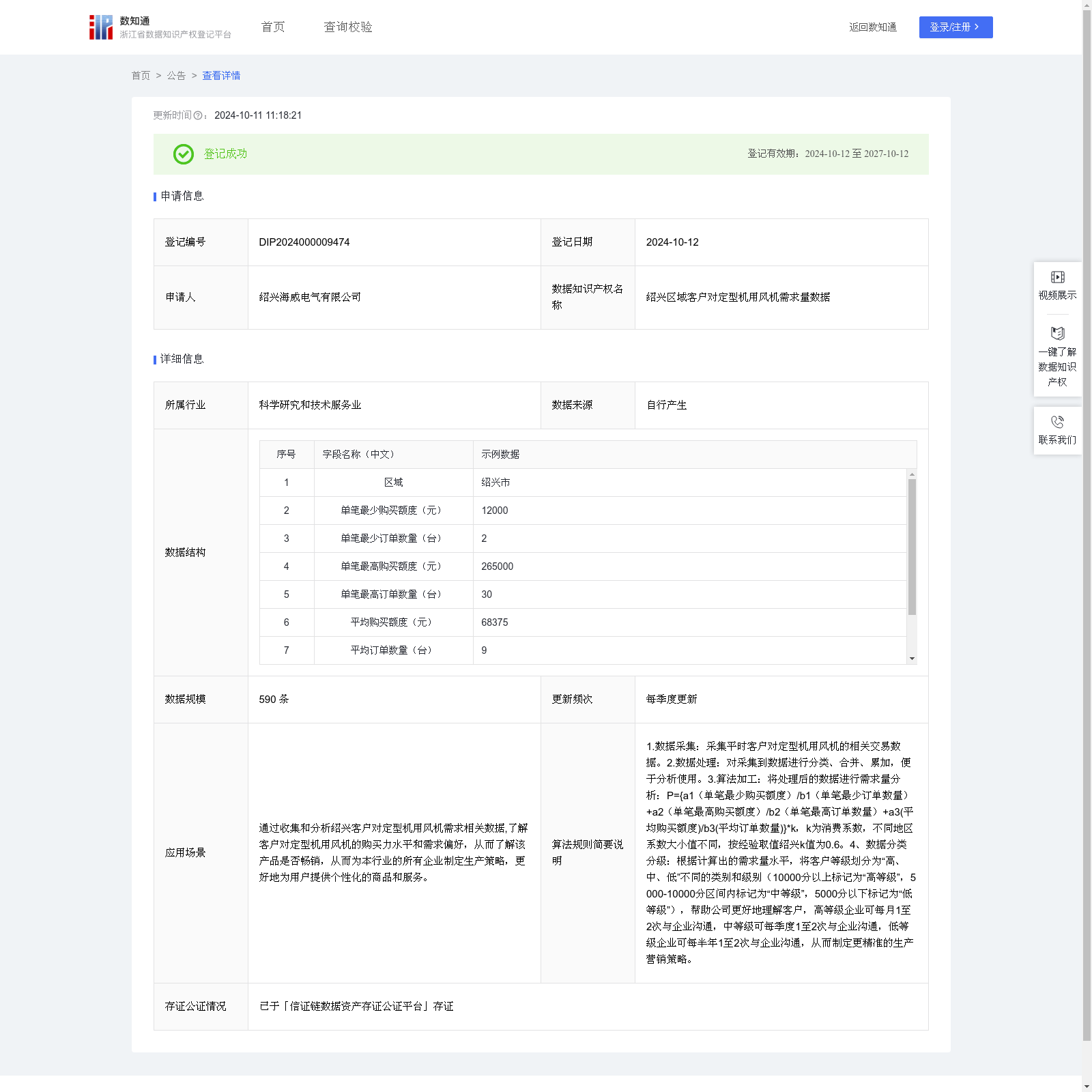 绍兴海威电气有限公司 本次登记的数据知识产权 绍兴区域客户对定型机用风机需求量数据, 通过收集和分析绍兴客户对定型机用风机需求相关数据,了解客户对定型机用风机的购买力水平和需求偏好,从而了解该产品是否畅销,从而为本行业的所有企业制定生产策略,更好地为用户提供个性化的商品和服务。1.数据采集:采集平时客户对定型机用风机的相关交易数据。2.数据处理:对采集到数据进行分类、合并、累加,便于分析使用。3.算法加工:将处理后的数据进行需求量分析:P=a1(单笔最少购买额度)/b1(单笔最少订单数量)+a2(单笔最高购买额度)/b2(单笔最高订单数量)+a3(平均购买额度)/b3(平均订单数量)*k,k为消费系数,不同地区系数大小值不同,按经验取值绍兴k值为0.6。4、数据分类分级:根据计算出的需求量水平,将客户等级划分为“高、中、低”不同的类别和级别(10000分以上标记为“高等级”,5000-10000分区间内标记为“中等级”,5000分以下标记为“低等级”),帮助公司更好地理解客户,高等级企业可每月1至2次与企业沟通,中等级可每季度1至2次与企业沟通,低等级企业可每半年1至2次与企业沟通,从而制定更精准的生产营销策略。