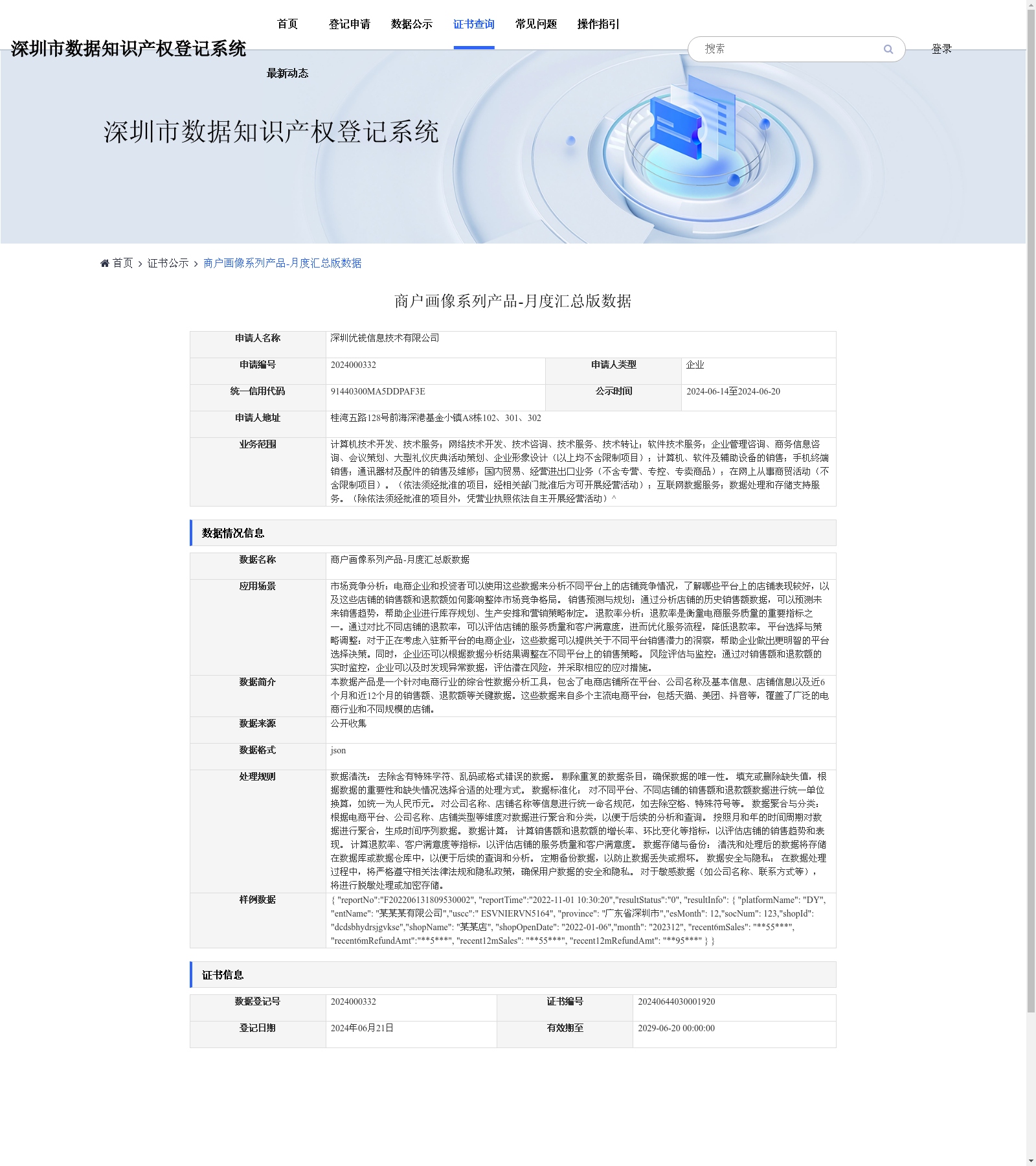 深圳优钱信息技术有限公司 本次登记的数据知识产权 商户画像系列产品-月度汇总版数据, 市场竞争分析:电商企业和投资者可以使用这些数据来分析不同平台上的店铺竞争情况,了解哪些平台上的店铺表现较好,以及这些店铺的销售额和退款额如何影响整体市场竞争格局。 销售预测与规划:通过分析店铺的历史销售额数据,可以预测未来销售趋势,帮助企业进行库存规划、生产安排和营销策略制定。 退款率分析:退款率是衡量电商服务质量的重要指标之一。通过对比不同店铺的退款率,可以评估店铺的服务质量和客户满意度,进而优化服务流程,降低退款率。 平台选择与策略调整:对于正在考虑入驻新平台的电商企业,这些数据可以提供关于不同平台销售潜力的洞察,帮助企业做出更明智的平台选择决策。同时,企业还可以根据数据分析结果调整在不同平台上的销售策略。 风险评估与监控:通过对销售额和退款额的实时监控,企业可以及时发现异常数据,评估潜在风险,并采取相应的应对措施。