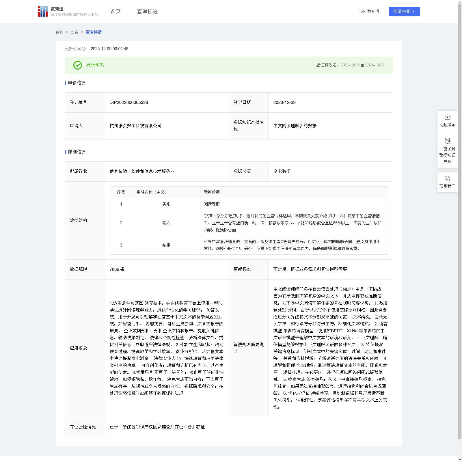 杭州谦贞数字科技有限公司 本次登记的数据知识产权 中文阅读理解训练数据, 1.适用条件与范围 教育技术:在在线教育平台上使用,帮助学生提升阅读理解能力,提供个性化的学习建议。 问答系统:用于开发可以理解和回答基于中文文本的复杂问题的系统,如智能助手。 内容摘要:自动生成新闻、文章或报告的摘要。 企业数据分析:分析企业文档和报告,提取关键信息,辅助决策制定。 法律和合规性检查:分析法律文件,提供相关信息,帮助遵守法律法规。 2.对象 学生和教师:辅助教育过程,提高教学和学习效率。 商业分析师:从大量文本中快速提取商业洞察。 法律专业人士:快速理解和应用法律文档中的信息。 内容创作者:理解和分析已有内容,以产生新的创意。 3.禁用场景 不用于非法目的:禁止用于任何非法活动,如侵犯隐私、欺诈等。 避免生成不当内容:不应用于生成有害、歧视性或令人反感的内容。 数据隐私和安全:在处理敏感信息时必须遵守数据保护法规中文阅读理解任务在自然语言处理(NLP)中是一项挑战,因为它涉及到理解复杂的中文文本,并从中提取或推断信息。以下是中文阅读理解任务的算法规则简要说明: 1. 数据预处理 分词:由于中文写作不使用空格分隔词汇,因此需要通过分词算法将文本分割成单独的词汇。 文本清洗:去除无关字符,如标点符号和特殊字符,标准化文本格式。 2. 语言模型 预训练语言模型:使用如BERT、XLNet等预训练的中文语言模型来理解中文文本的语境和语义。 上下文理解:确保模型能够根据上下文理解词语的多种含义。 3. 特征提取 关键信息标识:识别文本中的关键实体、时间、地点和事件等。 关系和依赖解析:分析词语之间的语法关系和依赖。 4. 理解和推理 文本理解:通过算法理解文本的主题、情感和意图。 逻辑推理:在必要时,进行推理以回答问题或提取信息。 5. 答案生成 答案抽取:从文本中直接抽取答案。 抽象和综合:如果无法直接抽取答案,进行抽象和综合以生成回答。 6. 优化与评估 持续学习:通过新数据和用户反馈不断优化模型。 性能评估:定期评估模型在不同类型文本上的表现。